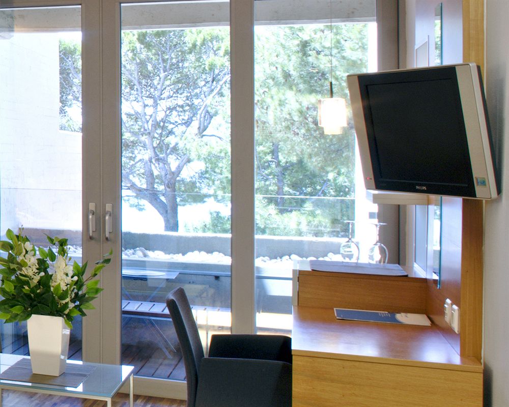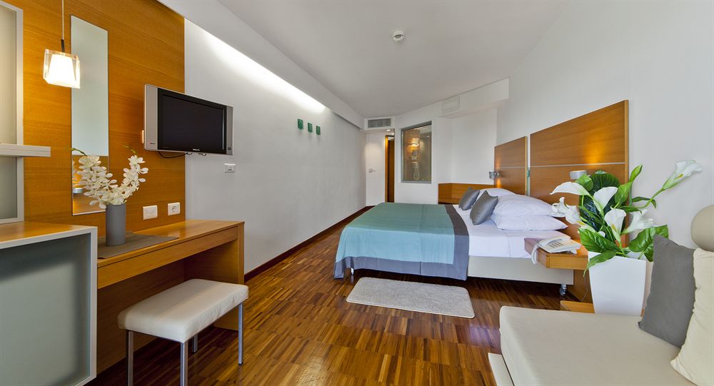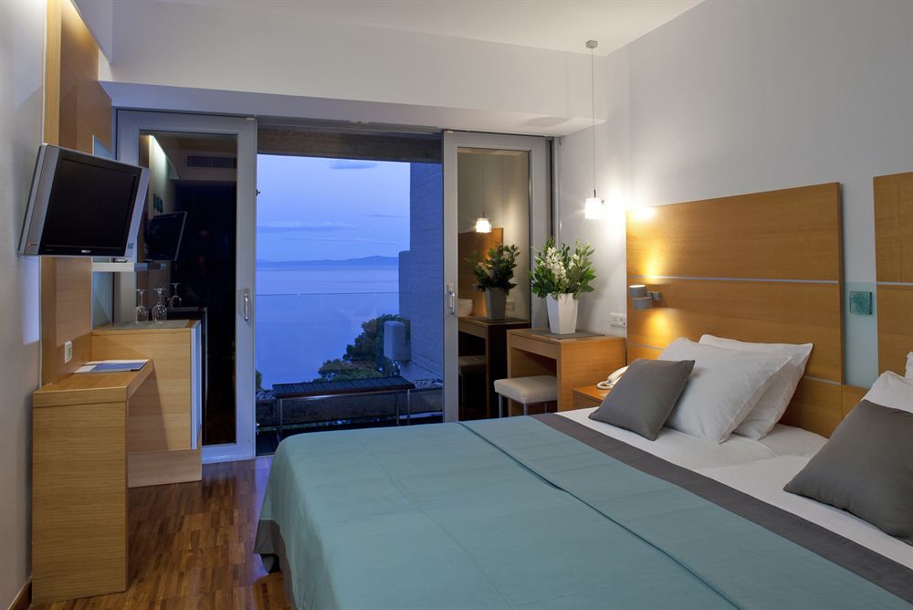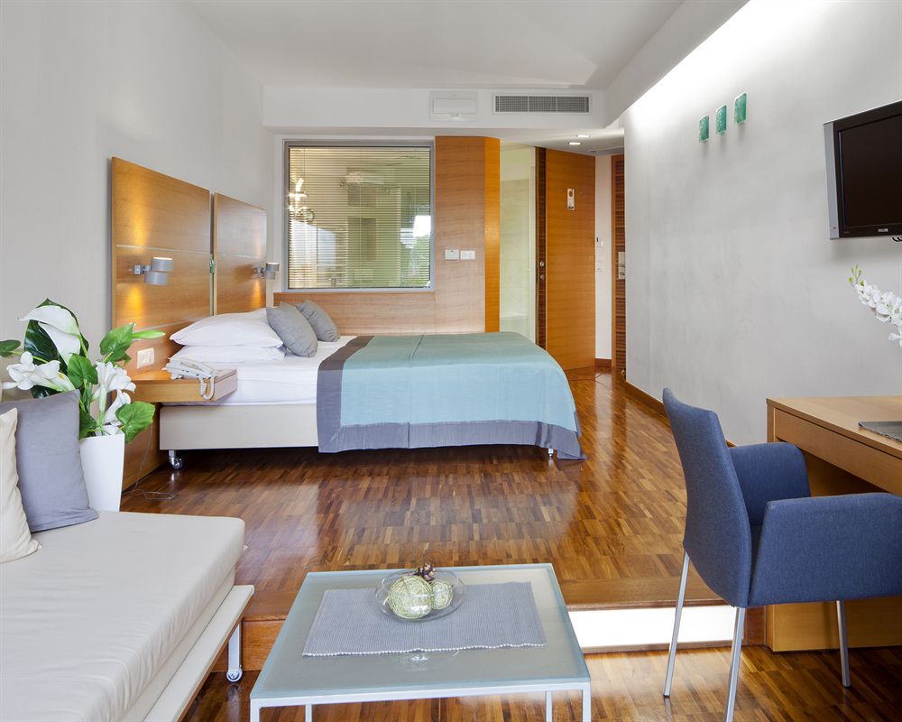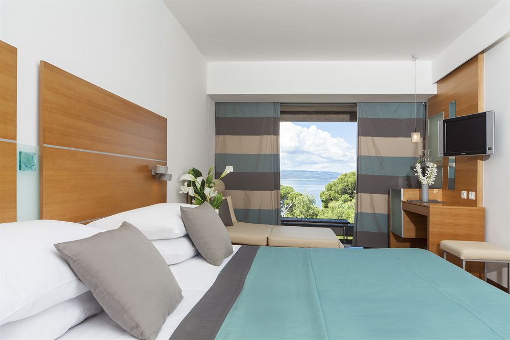 Большинство номеров имеет вид на море. В номере- 2 соединенные кровати и раскладное кресло - диван на одного человека. Современный дизайн номера дополняется функциональной мебелью.