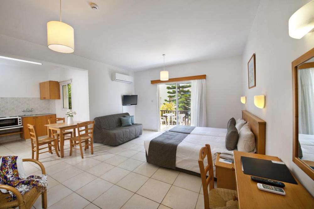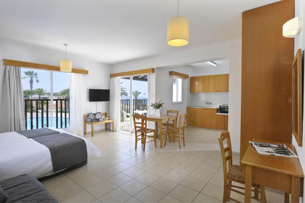 Akti Beach Village Resort пропонує просторі однокімнатні, односпальні та двоспальні апартаменти на будь-який смак. У нашому готелі буде комфортно сім'ям з чотирьох осіб і подружнім парам, які проводять медовий місяць. Всі номери люкс оснащені вітальнею з кухнею у відкритому плануванні, а також балконом та всіма сучасними зручностями.