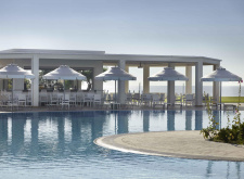 Deluxe Junior Suite Sea View Sharing Pool – 45 кв.м (макс. 3+1): спальня з 2 односпальними ліжками, з'єднаними в одне, окрема вітальня з 2 диванами-ліжками, розсувні двері, ванна кімната з ванною та душем, обладнана тераса із загальним басейном у 80 кв.м.