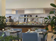 Головний ресторан.  Таверна «Blue»: обід по системі «шведський стіл» та вечеря a la carte, 1 відвідування гостей по системі AI.  Лобі-бар «Blue».  Бар біля басейну.  Кав'ярня-винний бар.  Закусочна (у сусідньому Apollo Beach Hotel). Діє дрес-код.