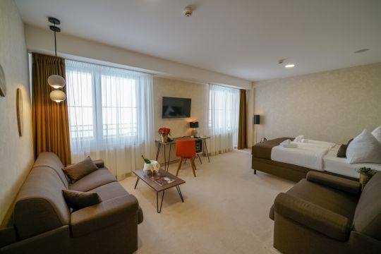 Стандартне обладнання номерів включає письмовий стіл зі стільцем, шафи для одягу, телефон, сейф, міні-бар, вбудований фен, супутникове телебачення та Wi-Fi. Номер «Ексклюзив» з видом на долину чи гори – це сучасний та стильно обставлений номер із привабливим дизайном. Номер з балконом надається за додаткову плату. У номері є велике двоспальне ліжко та розкладний диван, який також можна використовувати як окреме повноцінне ліжко для дорослої людини. В окремій ванній кімнаті є ванна або душ і туалет. Стандартне обладнання включає письмовий стіл зі стільцем, шафи для одягу, телефон, сейф, міні-бар, вбудований фен, супутникове телебачення та Wi-Fi. Ексклюзивні апартаменти Junior з видом на долину або гори - це сучасні просторі апартаменти з елегантними меблями. У номері є велике двоспальне ліжко і ще два ліжка .В окремій ванній кімнаті є ванна або душ і туалет. Гранд-Апартаменти з видом на долину або гори забезпечують комфортне розміщення в елегантному стилі. Номер складається з двох окремих кімнат з великим двоспальним ліжком та розкладним диваном, який можна використовувати як повноцінне ліжко для двох осіб. В окремій ванній кімнаті є ванна або душ і туалет. Апартаменти DeLuxe Grand з балконом та видом на долину – найбільші апартаменти з масивними розкішними меблями та балконом. У номері є спальня з великим двоспальним ліжком та вітальня з великим диваном-ліжком, який можна використовувати як повноцінне додаткове ліжко для двох осіб, і два розкладні крісла, що слугують додатковим спальним місцем. В окремій ванній кімнаті є ванна або душ і туалет
