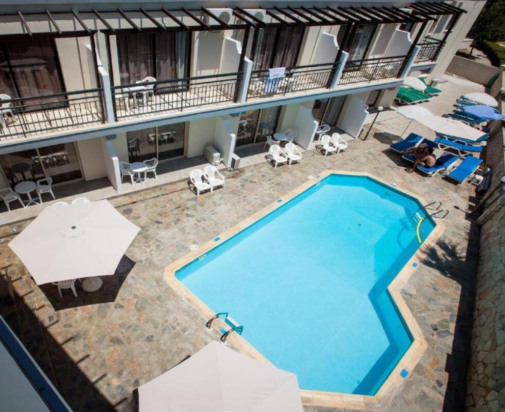 Плавальний басейн з терасою шезлонгами та парасольками, бар, кімната відпочинку з телевізором, обмін валют у приймальні.