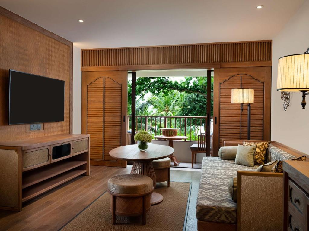Готель складається з 4 корпусів, всього 636 номерів. 424 Grand Room (49 м2); 46 Ocean View Room (49 м2, вид на океан); 50 Grand Club Room (49 м2, клубні привілеї); 37 Grand Club Deluxe room (51 м2, клубні привілеї); 26 Club Deluxe Ocean room (51 м2, клубні привілеї); 12 Grand Suite (98 м2, вітальня та спальня); 16 Grand Executive Suite (141 м2, вітальня, спальня); 17 Grand Club Suite (141 м2, спальня та вітальня, клубні привілеї); 3 Ambassador Suite (175 м2, спальня та вітальня, їдальня, робочий стіл, куточок для спа); 2 Presidential Suite (239 м2, спальня та вітальня, їдальня, робочий стіл, куточок для спа); 1 Villa Belibis (175 м2, спальня, вітальня, їдальня, міні-кухня, патіо, послуги батлера, клубні привілеї); 1 Villa Beratan (192 м2, 2 спальні, вітальня, їдальня, міні-кухня, патіо з приватним басейном та джакузі, послуги батлера, клубні привілеї); 1 Villa Tamblingan (407 м2, 3 спальні, вітальня, їдальня, міні-кухня, патіо, приватний басейн, джакузі, послуги батлера, клубні привілеї). Привілеї Grand Club: клубна вітальня, окремі сніданки, протягом дня прохолодні напої, чай та кава, вечірні коктейлі, щоденно свіжа преса, журнали, окремий басейн для даної категорії номерів. У номерах room service: цілодобово, платно, фен: є, телевізор: є, CD/DVD-програвач (за запитом), прибирання номера: щоденно, ванна та душ, телефон, міні-бар платно, підлога: керамічна плитка (дерево), зміна білизни: екосистема, балкон, Інтернет: Wi-Fi, прасувальна дошка: є, кавоварка, зміна рушників: екосистема, халат, кондиціонер: є,сейф: є, праска: є.