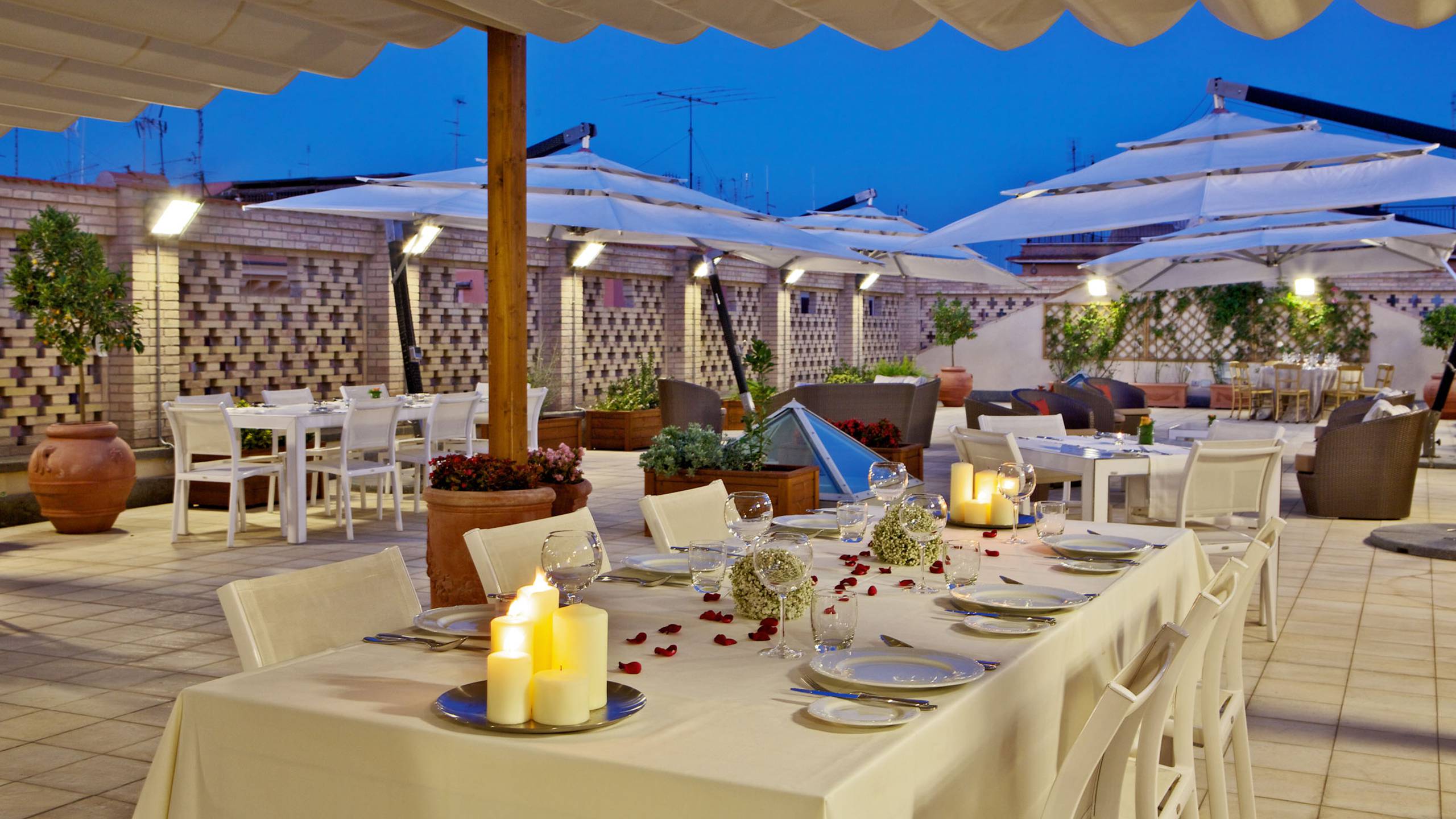 ТЕРАСА І БАР НА ДАХУ Наша тиха тераса на даху має чудовий італійський сад. Це чудове місце для відпочинку після денного огляду визначних пам’яток Рима, яке особливо привабливе в сутінках і довгими літніми вечорами. У теплу пору року на терасі на даху встановлені шезлонги та столики, щоб гості могли насолоджуватися коктейлями, напоями та простими стравами, приготованими щойно в барі та на грилі. Тераса також доступна для груп і спеціальних заходів. Він може обслуговувати до 100 осіб. Ви можете запланувати інтимну вечерю, весілля, гала-захід та вечірку. Зв’яжіться з нашою командою обслуговування гостей, щоб дізнатися про дні роботи та отримати додаткову інформацію.