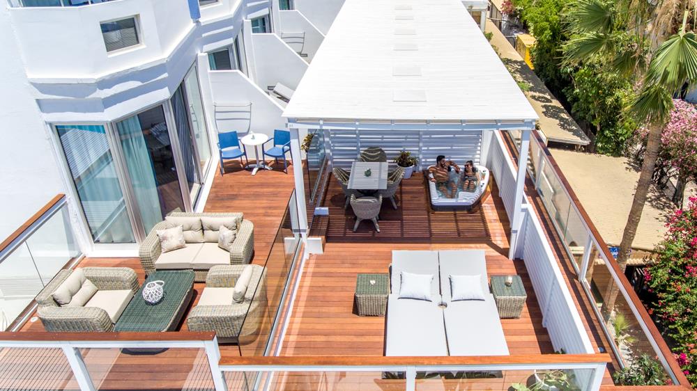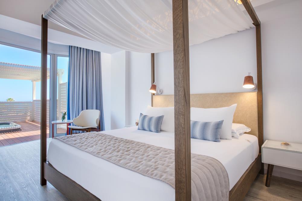 Junior Suite Sea View with Private Jacuzzi Площа: 27 кв. Вміщує: максимум 2 особи Ліжка: Двоспальне ліжко Тому що витончений та елегантний, виконаний у традиційному середземноморському стилі; ці номери з власною верандою та джакузі дають відчуття раю. У цьому напівлюксі з видом на море і джакузі є ванна кімната з ванною і туалетом, багатий вибір туалетного приладдя, еспресо-машина, туалетний столик, кондиціонер/система опалення, прямий міжнародний телефон, сейф, безкоштовний бездротовий доступ в Інтернет, розкладний диван (за запитом), (заповнюється за запитом), РК-телевізор з радіоканалами, приладдя для чаю/кави, халати та капці, фен.