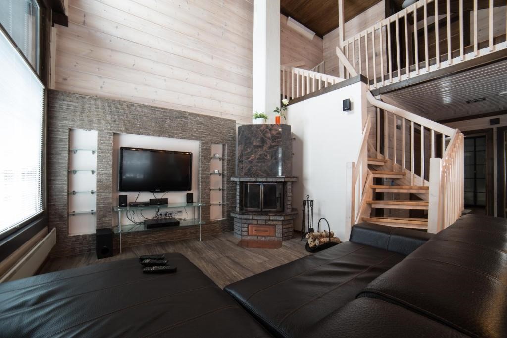 У котеджі (Levi Holidays, Сottage 8+1 pax, 4 bdrs 240 м2, житлова 150 м2): на першому поверсі: кухня, вітальня (ТВ/DVD/Karaoke), камін, 2 спальні, душова, туалет, ванна кімната, сауна (вихід на терасу). На другому поверсі: 2 спальні з виходом на балкон, телевізор, туалет, умивальник, пральна машина. Кухня обладнана сучасним побутовим обладнанням, посуд, плита, духова шафа, холодильник, посудомийна машина, мікрохвильова піч, кавоварка, чайник, тостер, пральна машина, сушильна шафа, праска та прасувальна дошка, розетка для обігріву автомобіля, дрова для каміна. Wi-Fi (безкоштовно); максимальне розміщення 8 дор. + 1 дод. місце