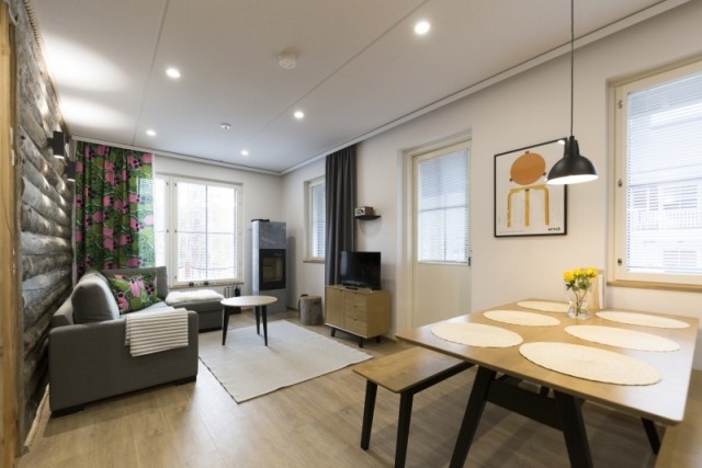 В усіх апартаментах:власна електрична сауна, електричне опалення, гаряча та холодна вода, обладнана кухня (холодильник, морозильна камера, посудомийна машина, індукційна електроплита з духовкою, мікрохвильова піч, кавоварка, чайник, набір посуду), пральна машина, сушильна шафа для одягу, утю дошка; 2 x 32" Smart TV з кабельними каналами (Netflix, Yle Arena, C More і т.д.), аудіо-система Tivoli Audio Model One BT (bluetooth мовлення), Wi-Fi, планшет Huawei MediaPad T3, посуд фінського дизайну ( Arabia, Iittala), двері з кодовим замком Yale, підігрів підлоги по всій площі, окрема витяжка, мебльована тераса