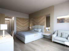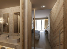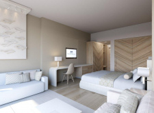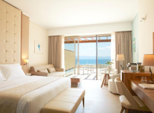 Junior Suite Sea View Pool Front East Wing – 37-39 кв.м (макс. 3+1): номер відкритого планування з двоспальним або 2 односпальними ліжками, ванна кімната з душем та ванною, обладнаний балкон або тераса з видом на море