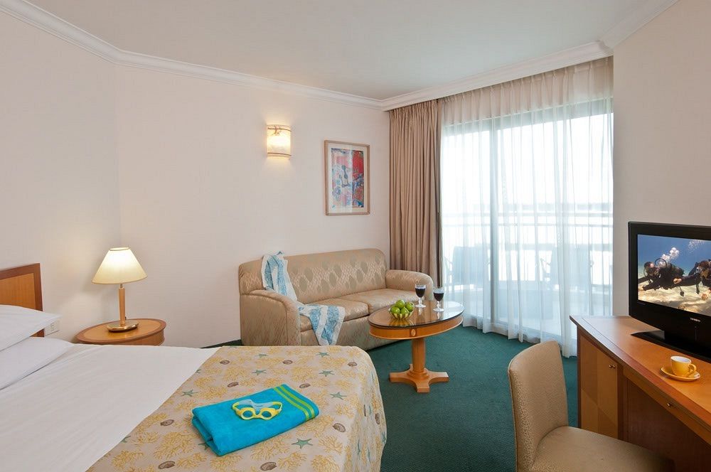 - стандартный номер - просторный номер с кроватью KING SIZE, раскладывающимся диваном, роскошной ванной, телевизором, мини-баром, кофейным уголком и личным сейфом. В номере могут остановиться до двух взрослых и двух детей; - номер с видом на бассейн - просторный номер с видом на бассейн (некоторые с балконом), оборудованный кроватью KING SIZE, раскладывающимся диваном, роскошной ванной, телевизором, мини-баром, кофейным уголком и личным сейфом. В номере могут остановиться до двух взрослых и двух детей; - панорамный номер - просторный номер с кроватью KING SIZE, раскладывающимся диваном, роскошной ванной, телевизором, мини-баром, кофейным уголком и личным сейфом. В номере могут остановиться до двух взрослых и двух детей; - свита "Палас" - роскошная свита состоит из спальни и большой гостиной, в которой есть уголок для отдыха. В каждой свите 2 роскошные ванные комнаты, 2 телевизора, просторный балкон с джакузи и видом на бассейн и лагуну, балкон с шезлонгами, а также мини-бар, кофейный уголок и личный сейф. В номере могут остановиться до четырех взрослых или двух взрослых и двух детей.