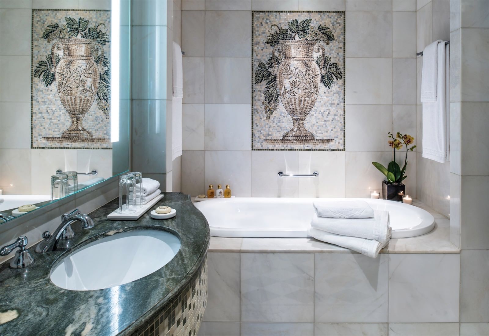 Плитка з каррарського мармуру та мозаїчний декор стін ручної роботи у ванній кімнаті