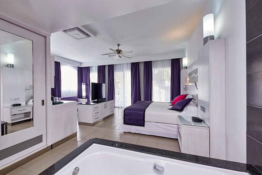 434 номери Покриття підлоги – керамічна плитка. Junior Suite/Suite Superior - 39 м², макс. 4 чол. | ліжко king-size або 2 double, диван або диван-ліжко у вітальні, гідромасажна ванна Jacuzzi Suite – 47 м², макс. 4 чол. | ліжко king-size, диван у вітальні, гідромасажна ванна, джакузі на терасі