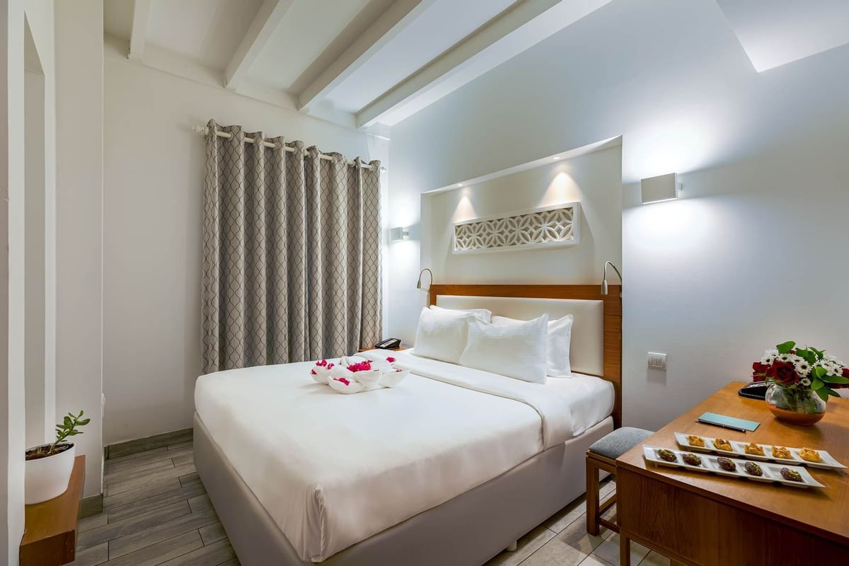Standard room- пропонує цей номер площею 36 кв. м з двома односпальними ліжками та окремою ванною кімнатою. У деяких номерах є невеликий внутрішній дворик, де можна поніжитися на ранковому сонці, а в інших - балкон, з якого можна розслабитися, милуючись вечірнім видом на пляж. З усіх номерів відкривається чудовий вид на пляж, сади та басейни. Murwab Suite - ідеальний для молодят або невеликої сім'ї, які шукають найкраще розміщення на пляжі на одному з найкращих курортів Катару для відпочинку, люкс площею 68 квадратних метрів пропонує поєднання розкоші та комфорту з окремою зоною для прийому гостей, кухнею та гостьовою ванною кімнатою. Al Bahr Chalet площею 77 кв.м складається з 2 спалень - з двоспальним ліжком та двома односпальними ліжками - та зручної вітальні, призначеної для відпочинку. Крім того, шале має невеликий внутрішній дворик із зоною для барбекю та прямим виходом на пляж, що робить його ідеальним місцем для відпочинку. Ocean villa- розкішна вілла площею 187 кв.м. Розроблена з думкою про розкіш, вона складається з 3 спалень - однієї головної та двох кімнат з роздільними ліжками, просторої вітальні та кухні, оснащеної першокласним кухонним обладнанням. Крім того, тут є просторе внутрішнє подвір'я та прямий доступ до пляжу, щоб ви могли насолодитися найкращим пляжним відпочинком у Катарі. Executive villa (278 кв.м) складається з трьох елегантно оформлених спалень, однієї службової кімнати та кухні, повністю обладнаної для всіх ваших кулінарних потреб. На додаток до цих неймовірних зручностей, ця прекрасна вілла з видом на озеро супроводжується садовим двориком, а також прямим доступом до пляжу. Executive Pool Villa (278 кв.м) може стати вашим домом далеко від дому на стільки часу, скільки вам потрібно. Вона складається з трьох елегантно оформлених спалень, однієї службової кімнати та кухні, повністю обладнаної для всіх ваших кулінарних потреб. На додаток до цих неймовірних зручностей, ця прекрасна вілла має просторий басейн, щоб ви могли насолоджуватися своїм перебуванням, а також вид на озеро, супроводжується садовим двориком і прямим доступом до пляжу, що дає вам справжню суть преміум-відпочинку на катарському пляжному курорті. Пориньте у неперевершену розкіш Royal Villa (517 кв.м), яка є унікальною пропозицією серед пляжних курортів Катару. Ця вілла - не звичайна вілла. Тут є все, що може знадобитися для відпочинку чи відпустки. Тут є три спальні, одна службова кімната, повністю обладнана кухня, щоб задовольнити всі ваші потреби, простора вітальня, щоб задовольнити ваш комфорт, а також чотири ванні кімнати. Крім того, ця вілла з видом на озеро супроводжується садовим двориком і прямим доступом до пляжу. Крім того, ви насолоджуватиметеся комфортом і розкішшю власного приватного басейну, що втілює в собі все найкраще, що є в катарських пляжних курортах.