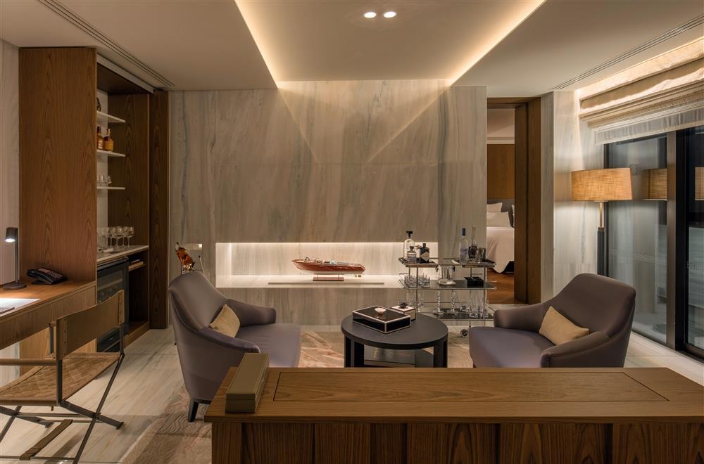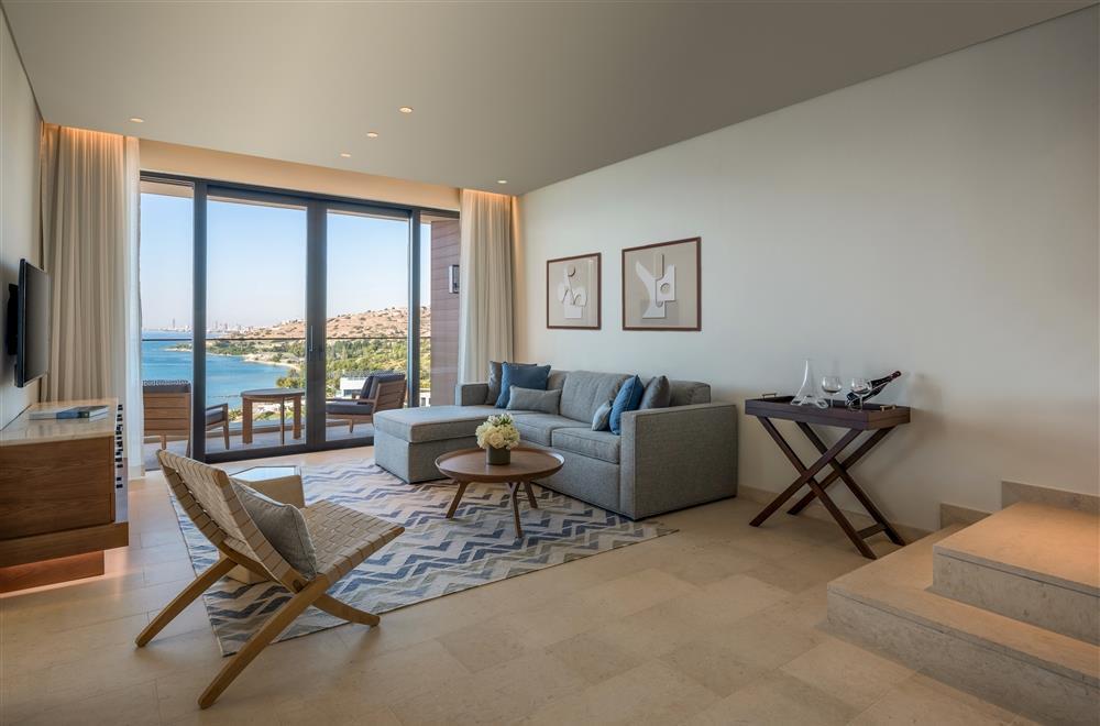 Deluxe Suite One Bedroom Sea View – 90 кв.м. (макс. 2+2): спальня з ліжком розміру "queen-size" або "king-size", вітальня з диваном, обідня зона, мармурова ванна кімната