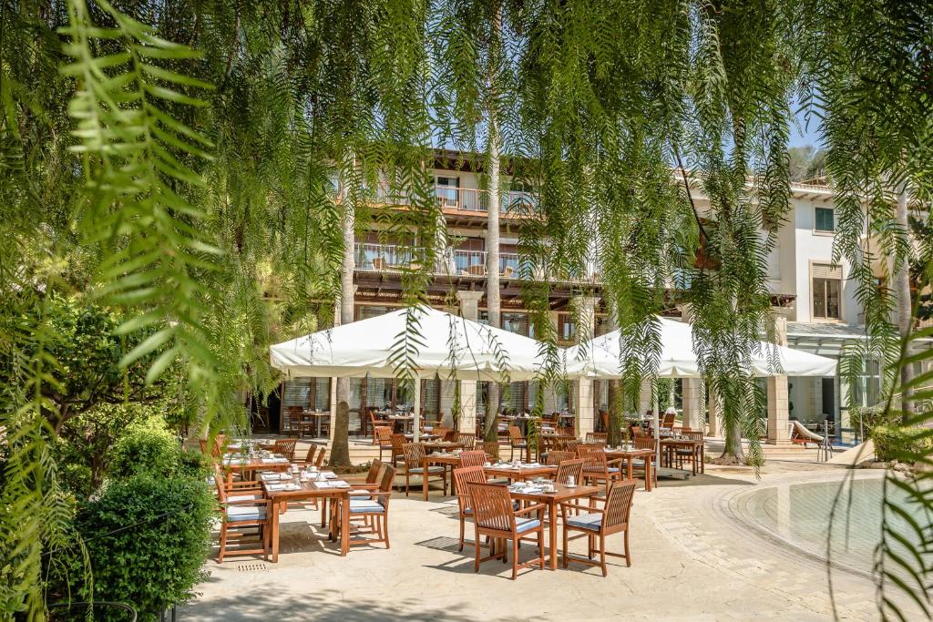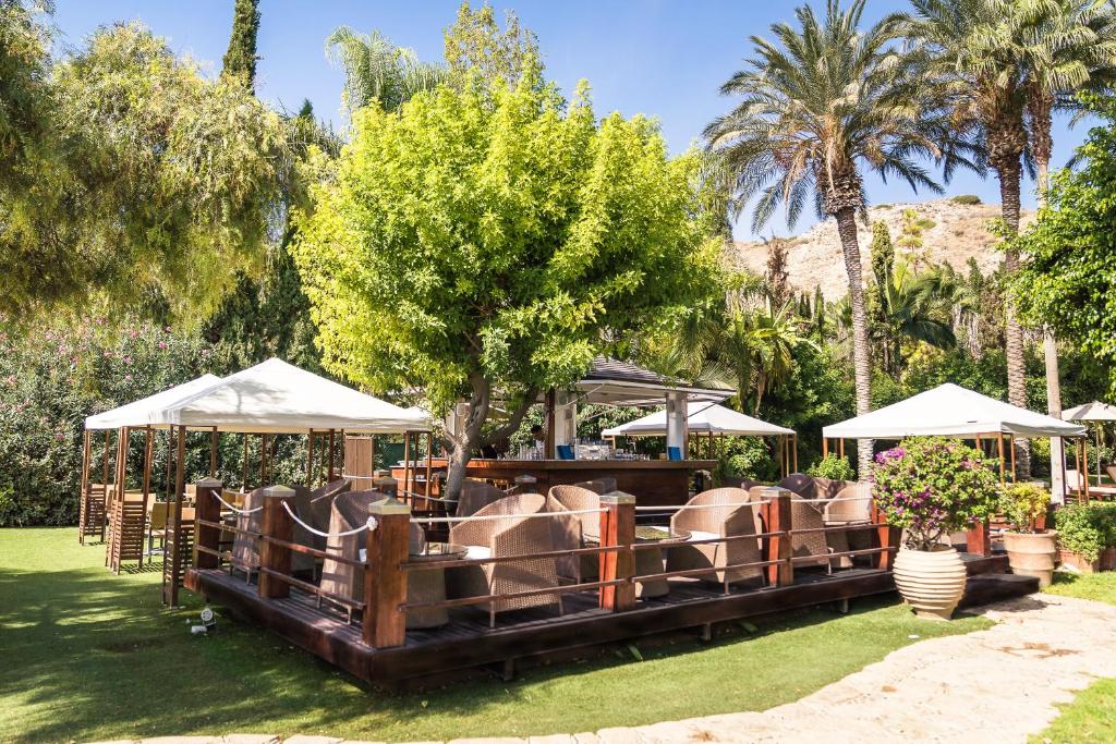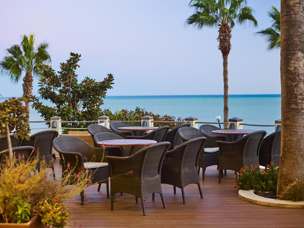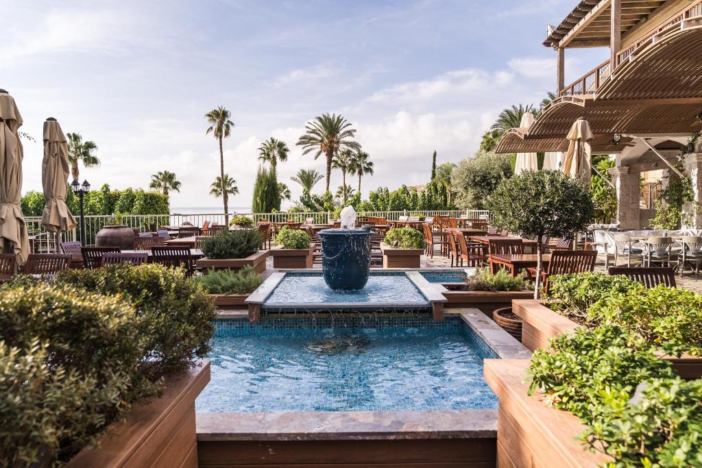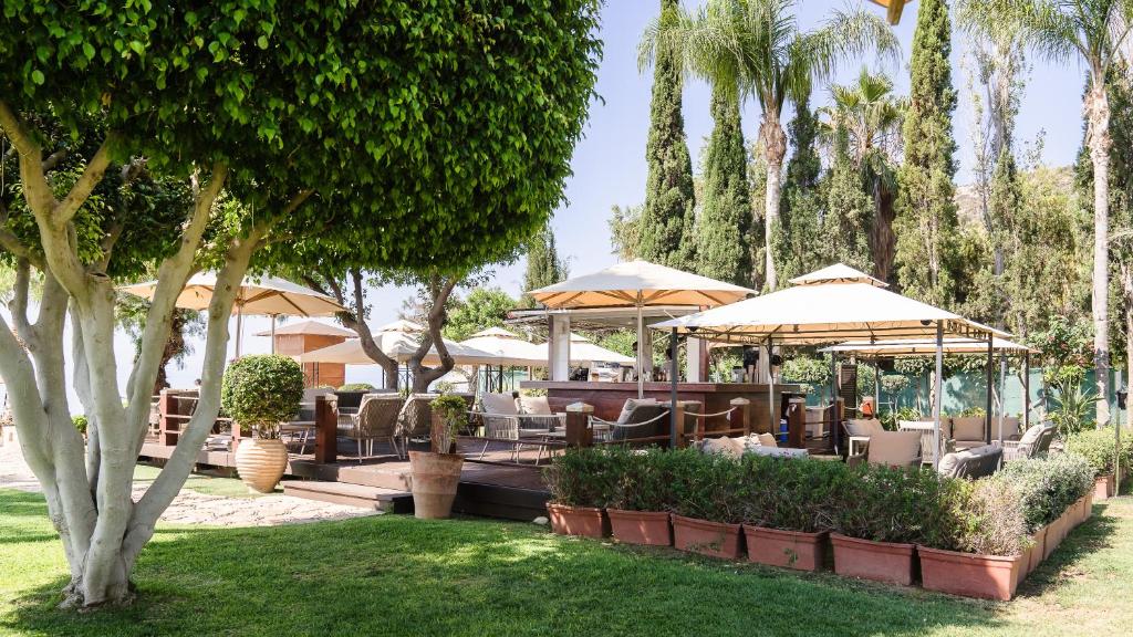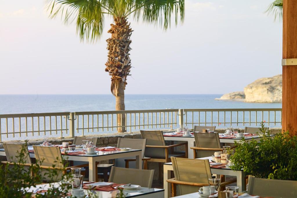 Бар-ресторан Cape Aspro: 07:00-22:30 сніданок-обід-вечеря, закуски Ресторан Bacchus: сніданок Пн-Пт 07:00-10:30, Сб-Нд 07:00-11:00, вечеря 19:00-22:00 Таверна Apollo: відкрита щодня з полудня – останнє замовлення їжі 22:30 (обід та вечеря), закуски, традиційна місцева кухня Коктейль-бар Eros: відкритий щодня з 09:00 до півночі The Ouzeri: 10:00-23:00, міцні напої, вина та закуски Пляжний бар Poseidon: 09:30-18:00, їжа подається з 11:00 до 18:00 Бар біля басейну Poseidon: 09:30-18:00, їжа подається з 11:00-18:00, гарячі та холодні закуски, напої, морозиво Бар Seven C’s: Нд-Чт 15:00-24:00, Пт та Сб 15:00-01:00, коктейлі, вина, кава, свіжі соки, закуски, морозиво Діє дрес-код smart casual.