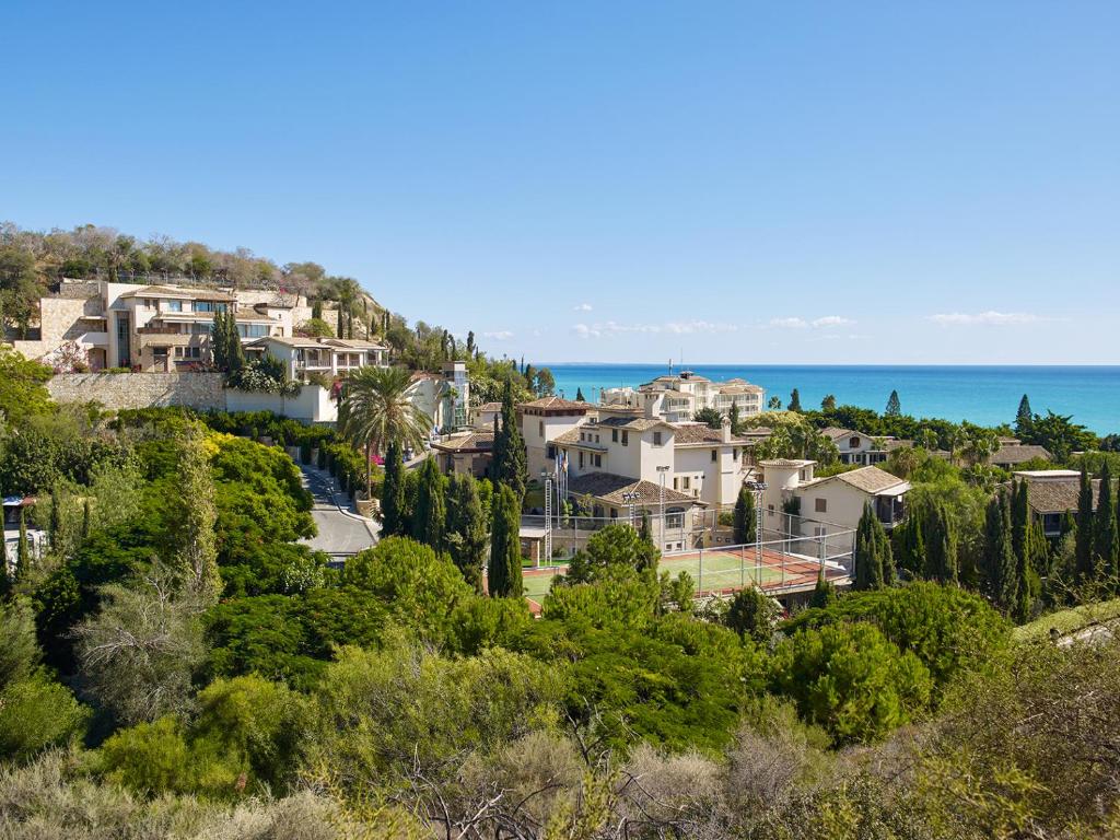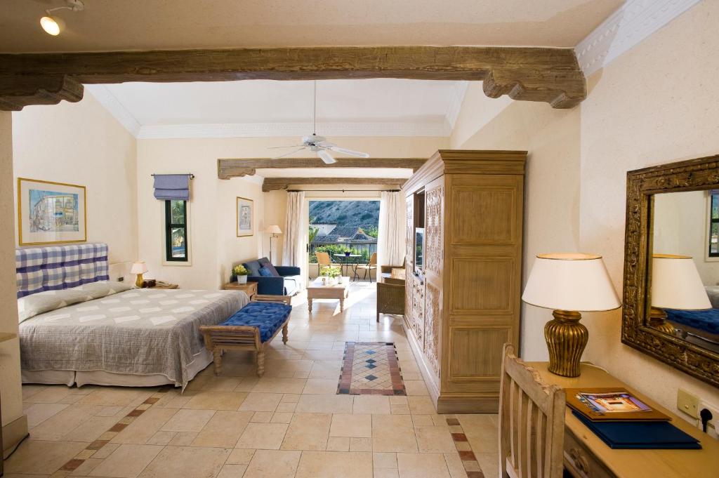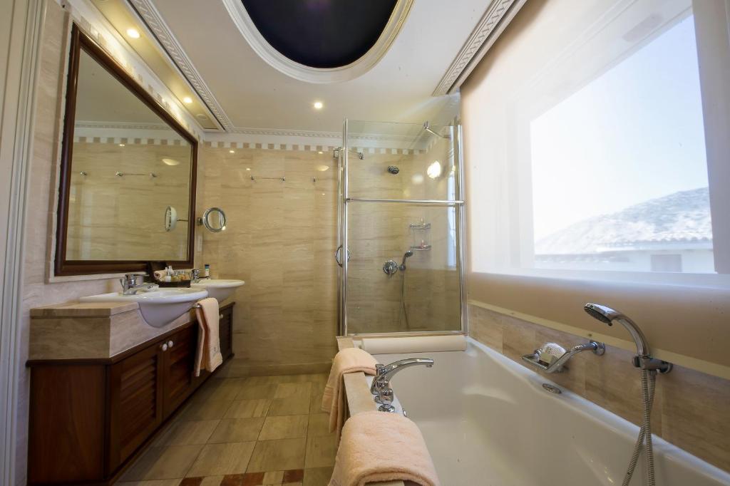 JUNIOR SUITE GARDEN VIEW – 43 кв.м (3 особи): кімната відкритого планування з двоспальним або двома односпальними ліжками, зона відпочинку з диваном, розкішна мармурова ванна кімната, мебльований дерев'яний балкон з видом на сад. Доступні суміжні люкси JUNIOR SUITE POOL VIEW – 43 кв.м (3 особи): кімната відкритого планування з двоспальним або двома односпальними ліжками, зона відпочинку з диваном, розкішна мармурова ванна кімната, мебльований дерев'яний балкон з видом на басейн. Доступні суміжні люкси JUNIOR SUITE SEA VIEW – 43 кв.м (3 особи): кімната з двоспальним або двома односпальними ліжками, зона відпочинку з диваном, ванна кімната з ванною та душем, мебльований дерев'яний балкон з видом на море. Доступні суміжні люкси EXECUTIVE SUITE INLAND VIEW – 47 кв.м (4 особи): кімната відкритого планування з двоспальним або двома односпальними ліжками, простора зона відпочинку, мармурова ванна кімната з ванною та душем, мебльований дерев'яний балкон EXECUTIVE SUITE GARDEN VIEW – 47 кв.м (4 особи): кімната відкритого планування з двоспальним або двома односпальними ліжками, простора зона відпочинку, мармурова ванна кімната з ванною та більшість з окремим душем, мебльований дерев'яний балкон EXECUTIVE SUITE POOL OR SIDE SEA VIEW – 47 кв.м (4 особи): кімната відкритого планування з двоспальним або двома односпальними ліжками, простора зона відпочинку, мармурова ванна кімната з ванною та окремим душем, мебльований дерев'яний балкон EXECUTIVE SUITE SEA VIEW– 60 кв.м (4 особи): кімната відкритого планування з двоспальним та двома односпальними ліжками, зона відпочинку, мармурова ванна кімната з ванною та окремим душем, мебльований дерев'яний балкон. EXECUTIVE SUITE SEA VIEW EAGLES NEST– 60 кв.м (4 особи): кімната відкритого планування з двоспальним або двома односпальними ліжками, простора зона відпочинку, мармурова ванна кімната з ванною та окремим душем, мебльований дерев'яний балкон. Ці люкси розташовані на невеликому пагорбі з видом на мис Аспро. EXECUTIVE SUITE SEA VIEW EAGLES NEST PRIVATE PLUNGE POOL – 60 кв.м (4 особи): кімната відкритого планування з двоспальним або двома односпальними ліжками, простора зона відпочинку, мармурова ванна кімната з ванною та окремим душем, мебльована тераса з приватним басейном. Ці люкси розташовані на невеликому пагорбі з видом на мис Аспро. SUITE ONE BEDROOM GARDEN VIEW – 51 кв.м (4 особи): спальня з двоспальним ліжком, окрема вітальня з диваном-ліжком, мармурова ванна кімната, мебльований балкон. FAMILY SUITE ONE BEDROOM SEA VIEW – 70 кв.м (4 особи): спальня відкритого планування з двоспальним або двома односпальними ліжками, простора зона відпочинку, власна ванна кімната, друга спальня з двома односпальними ліжками, розділеними розсувними дверима, власна ванна кімната, мебльований балкон. FAMILY SUITE TWO BEDROOMS BAY VIEW – 70 кв.м (5 осіб): головна спальня з двоспальним ліжком розміру "queen-size" та власною ванною кімнатою з ванною та душем, друга спальня з двома односпальними ліжками, окрема ванна кімната, зона відпочинку, мебльований балкон. CAPE SUITE – 60 кв.м (3 особи): кут східного головного корпусу курорту, кімната з двоспальним ліжком, велика зона відпочинку, відокремлена розсувними дверима, мармурова ванна кімната з ванною та душем, мебльований балкон. FAMILY SUITE TWO BEDROOMS SEA VIEW MAIN BUILDING – 84 кв.м (4 особи): Представницький поверх західного головного корпусу, головна спальня відкритого планування з двоспальним ліжком, зона відпочинку, ванна кімната з душем та гідромасажною ванною, друга спальня з 