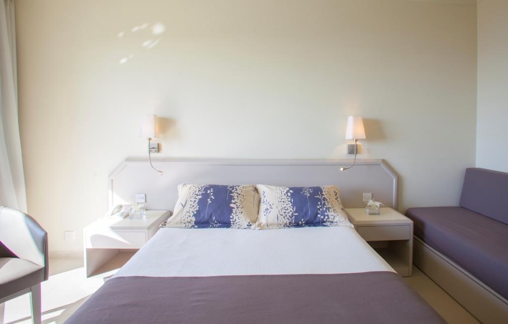 Family Room - Inland View or Sea View - Розміщення: до 4 осіб Ліжко(а): 1 двоспальне ліжко розміру "queen-size" та 2 дивани-ліжка Розмір: 26 м² Сімейні номери з видом на суходіл, місто Пафос та околиці або з видом на чудове Середземне море та басейни складаються зі спальні з одним двоспальним ліжком та 2 диванами-ліжками, розділеними декоративною напівроздільною перегородкою, що не закривається. Мармурові підлоги, приватний балкон та світлий, елегантний інтер'єр підходять для кожної родини.