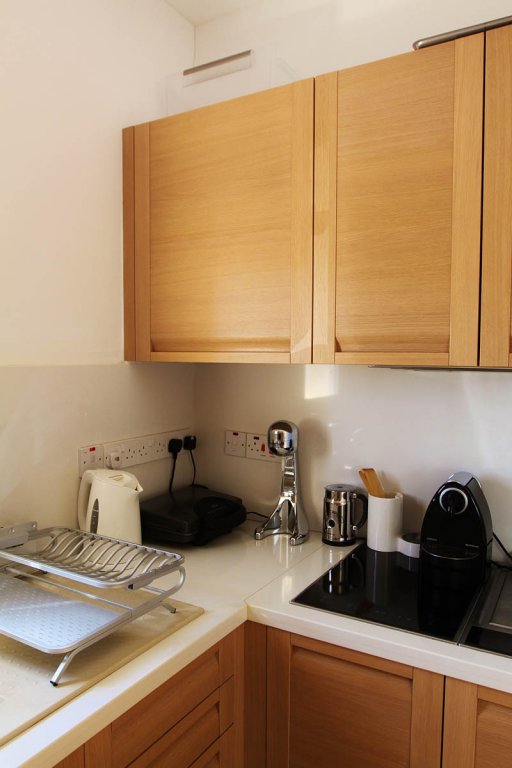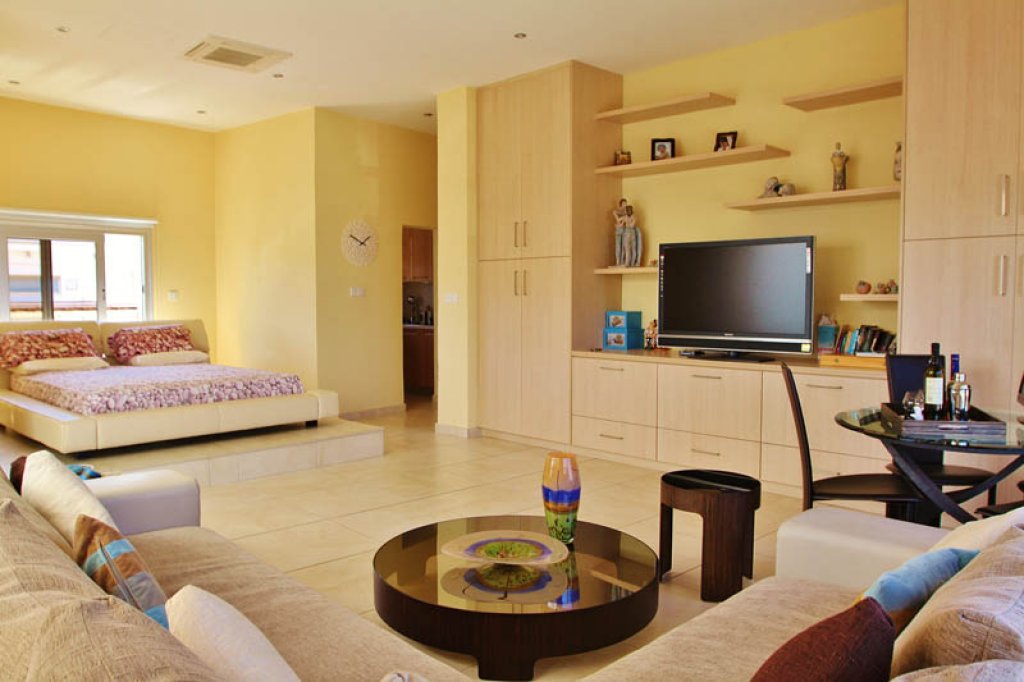 Студия оснащена большой двуспальной кроватью. В апартаментах есть также потрясающе большой балкон, где размещен стол, 4 стулья, несколько удобных мягких кресел и шезлонг. Здесь есть все необходимое для приготовления барбекю. Это единственные апартаменты в данном комплексе, которые имеют веранду такого размера и с возможностью приготовления барбекю.