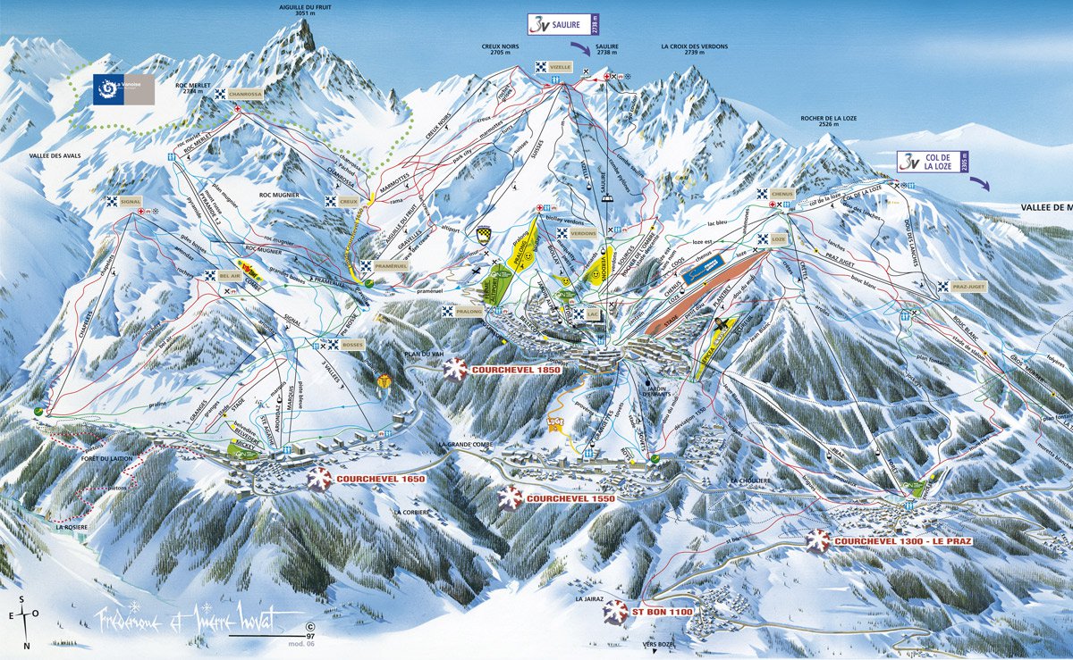 Альпійські села долини Куршевель розташовані на п’яти рівнях: Сен-Бон (Saint-Bon) 1100м, Ле-Праз (Le Praz) 1300м, Куршевель-1550 Куршевель-1650 і Куршевель-1850.