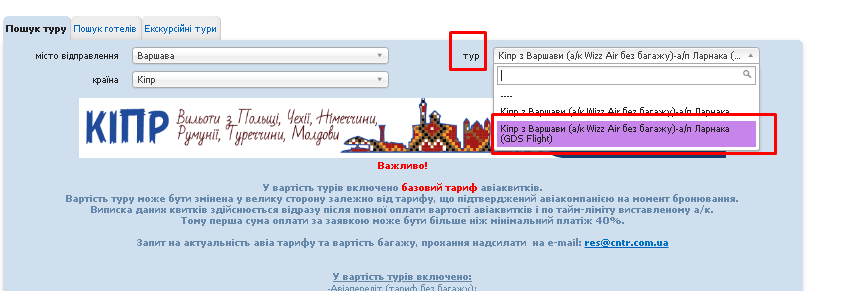 1. Заходимо в пошук турів по напрямку, що вас цікавить. Вибираємо відповідний тур із позначкою «GDS Flight».