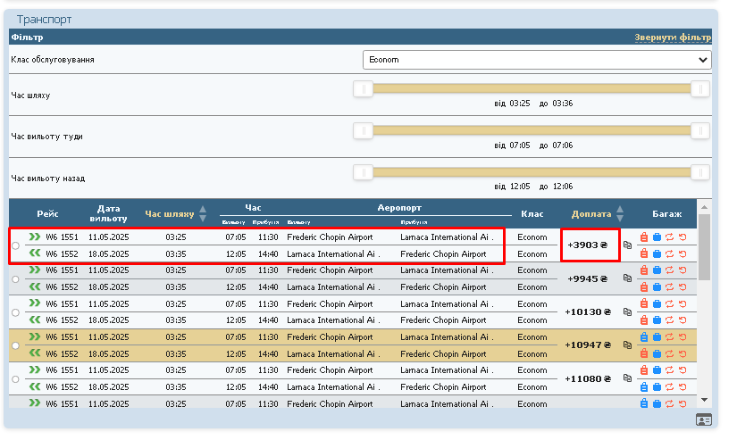 У цій формі можна вибрати певний рейс, клас обслуговування, параметри часу вильоту та розмір доплати на вибраний рейс.