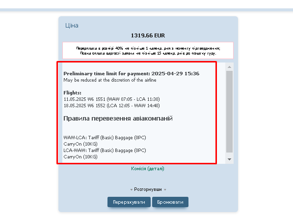 Тарифи можуть змінюватися у більший або менший бік під час внесення паспортних даних, тому після внесення паспортних даних пасажирів необхідно натиснути кнопку «Перерахувати» для формування підсумкової вартості.