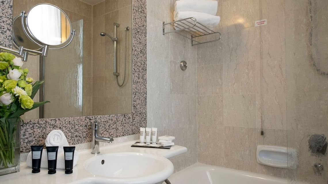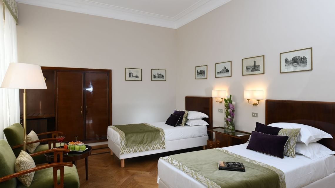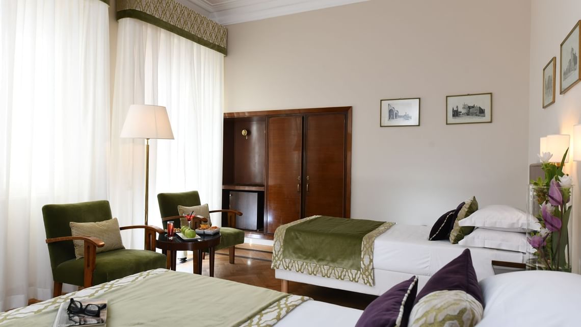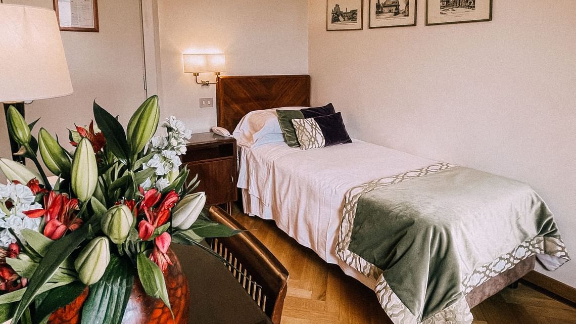 Classic single rooms Класичні одномісні номери мають меблі, які надають їм яскравої індивідуальності. Ванні кімнати з душем і ванною оздоблені травертином.