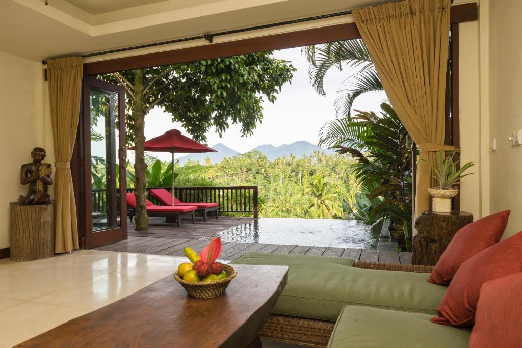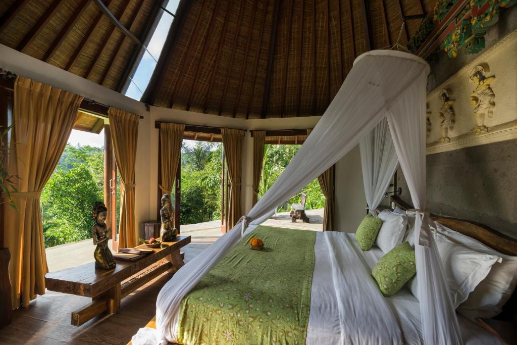 DEWI UTARI - ONE BEDROOM DUPLEX POOL VILLA  – двохкімнатна віла з басейном, розмір кімнати 150 м2, розрахована  на 2 дорослих + 1 дитина. Самотня серед місцевих дерев і обрамлена пишним тропічним садом із захоплюючим видом на рисові поля, пагорби та гори, вілла має власний невеликий басейн, який живиться природною джерельною водою, екзотичні штрихи місцевого вікового дерева та каменю, велику ванну кімнату, затишна вітальня з кухнею.
