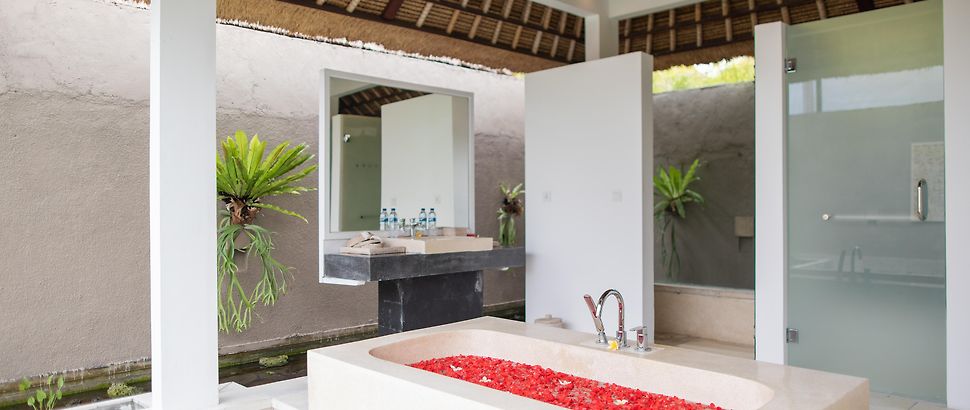 One Bedroom Pool Villa Premier  (площею 210 м2., дорослі: 2,Діти: 1)  оспівує дух кохання завдяки білому декору та сміливим червоним акцентам. Приголомшливий витвір мистецтва над ліжком є парою традиційних весільних головних уборів, які балійські пари носять у день весілля. Напіввідкрита ванна кімната з розкішною ванною, досить великою для двох.