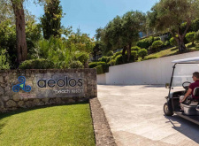 Популярний курорт розташований на зеленому схилі на території в 72 000 кв.м, звідки відкривається неповторний вид на Іонічне море та пишні сади. Чудовий пляж і близькість міста Корфу з його історичними та культурними пам'ятками, жвавим нічним життям та розважальними центрами перетворює Aeolos Beach Hotel на ідеальне місце як для романтичного відпочинку, так і для відпочинку всією родиною.  Місто Корфу: 10 км.  Аеропорт Корфу: 8 км.  Сільце Беніцес: 3 км. Палац Ахілліон: 2.5 км