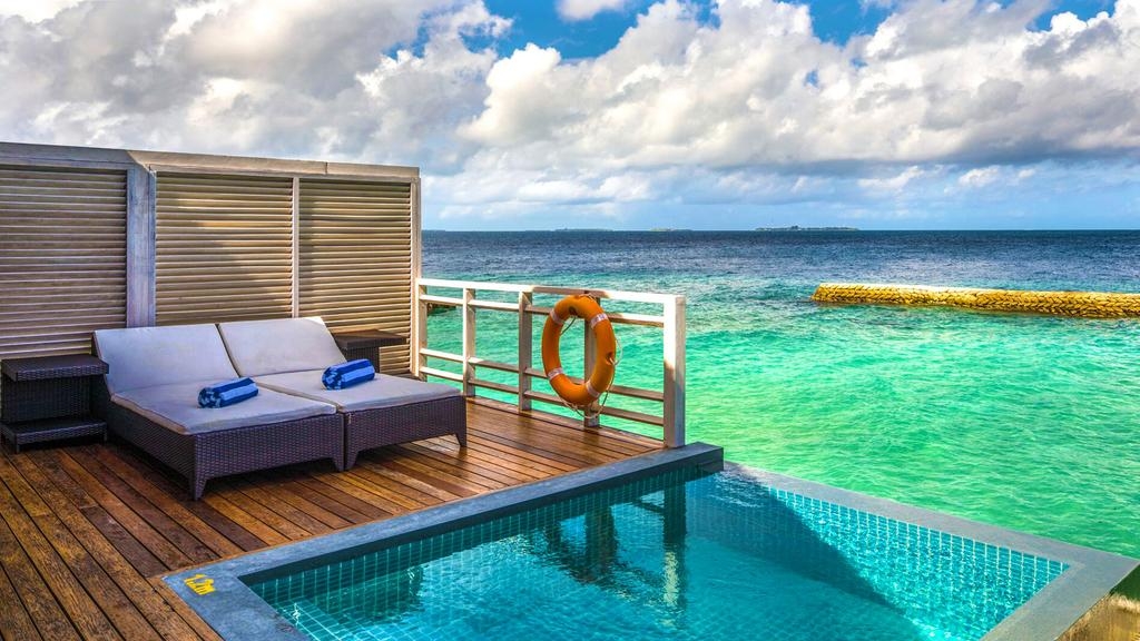 14 Water Villa (118 м., макс. 3 або 2+1 чол.). Комфортабельні водяні вілли. Тераса з лежаками, столиком та кріслами, невеликим «безкрайнім» басейном та прямим спуском у воду. Ліжко king-size, софа, ванна кімната з душем та ванною з функцією джакузі.