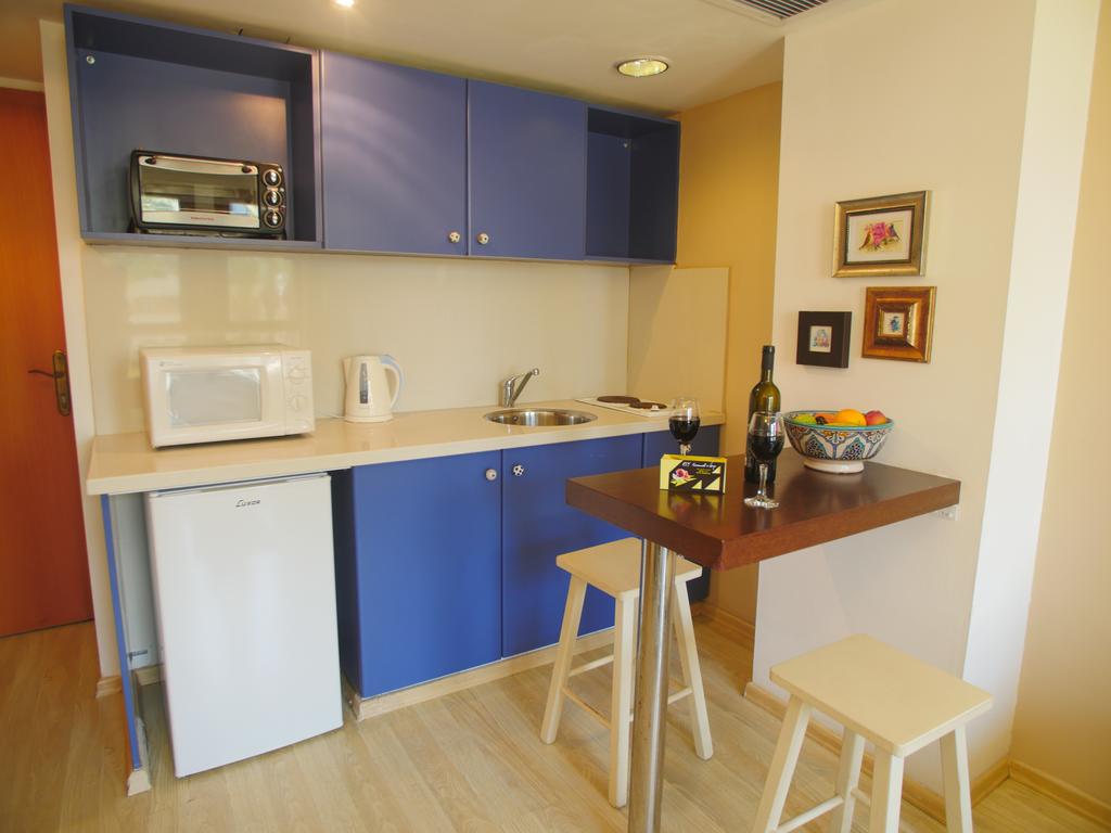 Студия делюкс – уютный номер с балконом, откуда открывается прекрасный вид на Средиземное море. В номере так же есть кухня со всеми удобствами, гостиная с ЖК-телевизором и диваном-кроватью. Комната для отдыха включает в себя двуспальную кровать, прикроватную тумбочку.