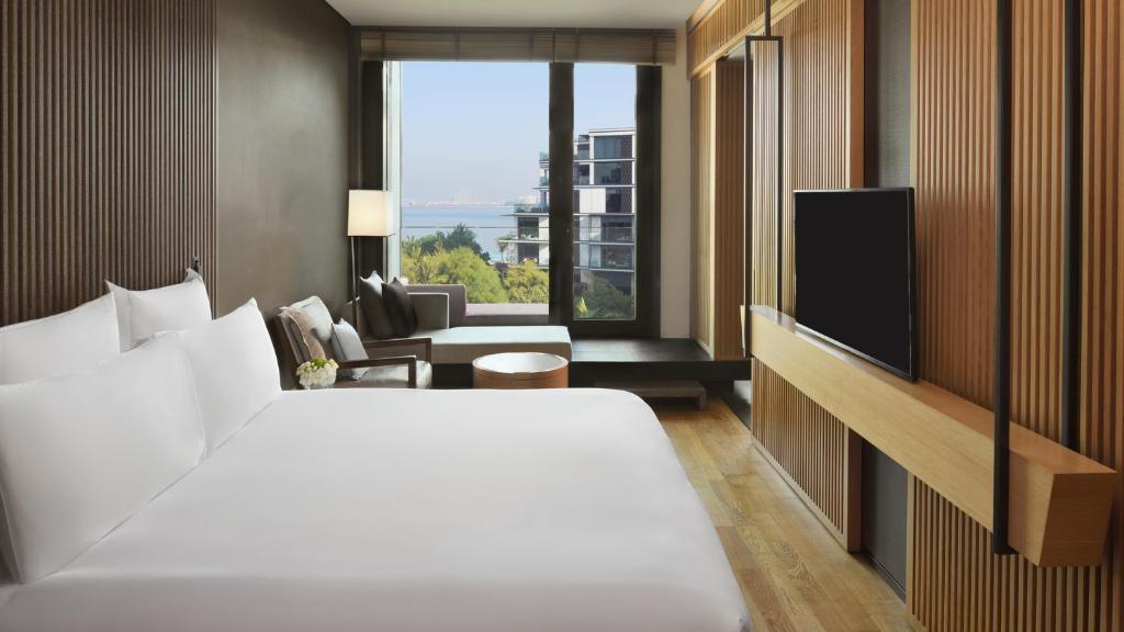 Serenity Ocean View - Пробудіть свої почуття в нашому чудово обладнаному номері Serenity з видом на океан, де з розкішного ліжка відкривається вражаючий вид на Перську затоку. Високі стелі та вікна на всю довжину заливають кімнату природним світлом, створюючи умови для вашого розслабляючого відпочинку. 54 кв.м з видом на океан.