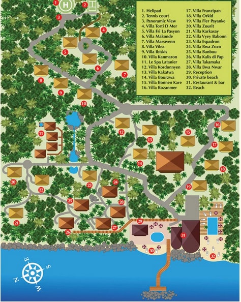 У готелі 24 номери (усі з видом на захід сонця):12 Hillside Villa (58 м² - внутрішні приміщення/ 22 м2 - балкон, макс. 2 чол.). Спальня (ліжко з балдахіном), зона відпочинку з диваном, вбиральня, частково відкрита ванна кімната з ванною, душ просто неба. Балкон з обіднім столом та стільцями. Номери знаходяться на височині, побудовані з дерева та каменю. Вид на сад. 7 Hideaway Villa (58 м² - внутрішні приміщення/ 22 м2 – балкон/ 20 м2 – зона саду, макс. 2 чол.). Спальня (ліжко з балдахіном), зона відпочинку з диваном, вбиральня, частково відкрита ванна кімната з ванною з функцією джакузі, душ просто неба. Балкон з обіднім столом та стільцями, шезлонги, приватний міні-садок. Частина номерів має прямий краєвид на океан. 5 Tortoise Suite (72 м² - внутрішні приміщення/28 м2 – балкон, макс. 4 чол.). Дві спальні, що мають різні входи з вулиці (одна з ліжком king-size та вітальнею, інша – з ліжками twin та зоною відпочинку), дві ванні кімнати (ванна та душ у кожній), дві вбиральні. Балкон з обіднім столом та стільцями, шезлонги. Вид на сад. У номерах сейф: є телефон, вбиральня, міні-бар, ТБ: супутникове, прибирання номера: щоденно, набір для приготування чаю/кави, балкон, ванна та душ, Інтернет: Wi-Fi, платно, room service: платно, кондиціонер: є, фен: є, CD/DVD-програвач, стельовий вентилятор, iPod/iPhone док-станція