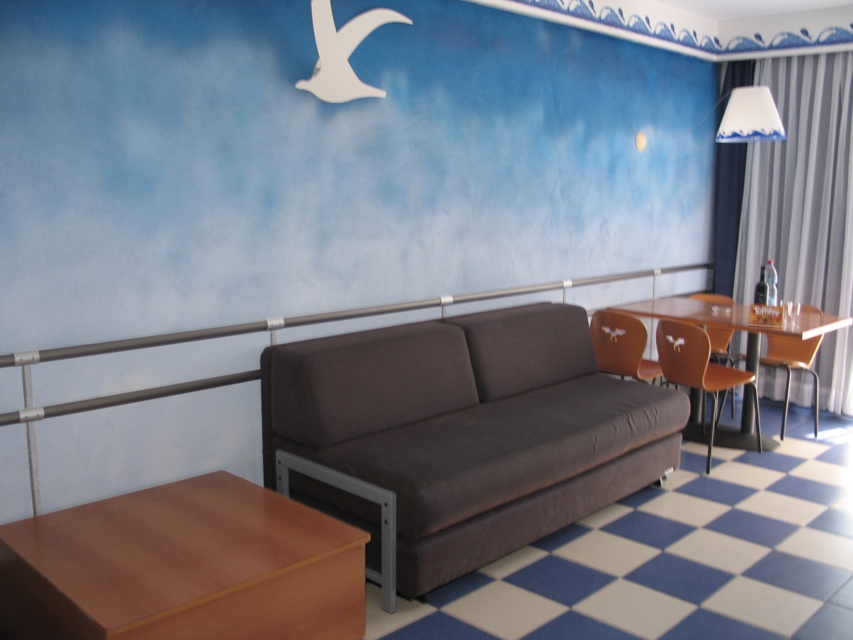 Все комнаты оригинально оформлены, состоят из просторной спальни, гостиной с диваном, раскладывающимся на две дополнительные кровати, ванной комнаты, в которой 2 отдельных входа, оборудованной кухни (холодильник, микроволновая печь, электрический чайник и др. Балкон на солнечной стороне. Также в номерах имеется 2 телевизора, сейф.