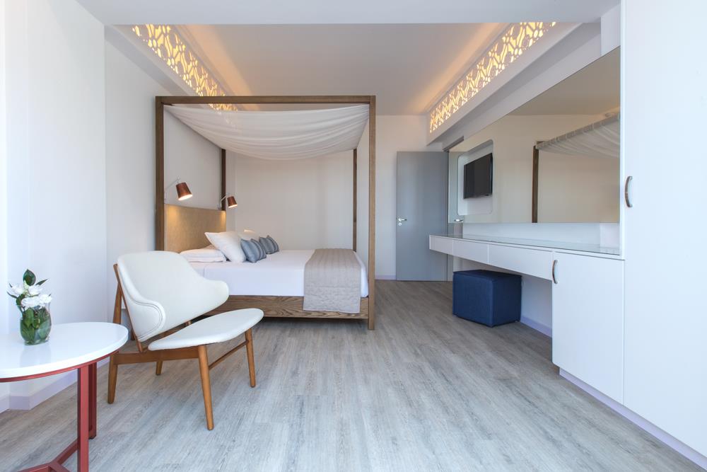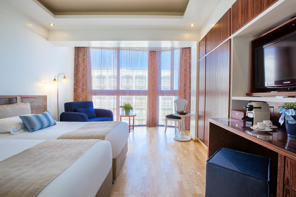 Premium Superior Side Sea View Room Площа: 23 кв. Вміщує: до 3 осіб Ліжка: два односпальні або двоспальні ліжка Сучасний дизайн, кожен із своєю індивідуальністю; Пропонуючи першокласний комфорт і визначний вид на Середземне море. У цьому покращеному номері «Преміум» є ванна кімната з ванною і туалетом, багатий вибір розкішного туалетно-косметичного приладдя, еспресо-машина, туалетний столик, система кондиціювання повітря/опалення, прямий міжнародний телефонний зв'язок, сейф, безкоштовний бездротовий доступ до Інтернету, розкладний диван. балкон, міні-бар (заповнюється за запитом), РК-телевізор з радіоканалами, халати та капці, приладдя для чаю/кави та фен.