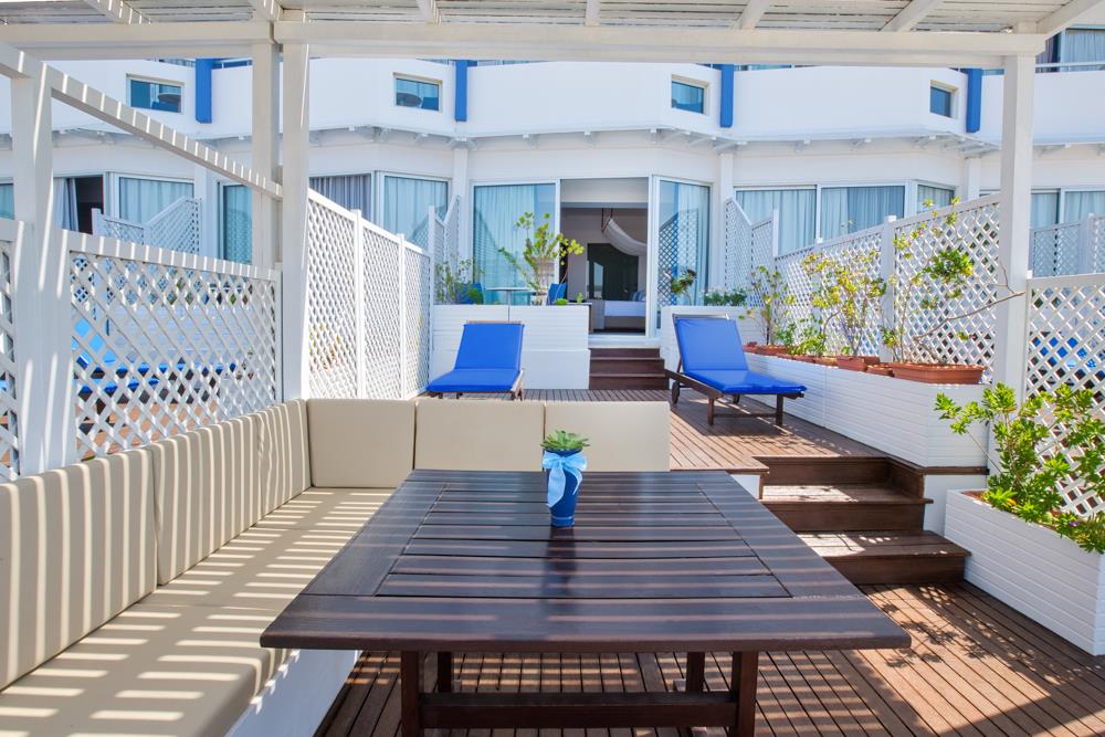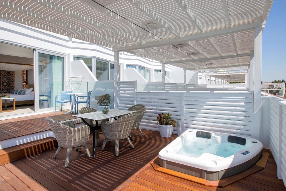 Junior Suite Sea View with Private Jacuzzi Площа: 27 кв. Вміщує: максимум 2 особи Ліжка: Двоспальне ліжко Тому що витончений та елегантний, виконаний у традиційному середземноморському стилі; ці номери з власною верандою та джакузі дають відчуття раю. У цьому напівлюксі з видом на море і джакузі є ванна кімната з ванною і туалетом, багатий вибір туалетного приладдя, еспресо-машина, туалетний столик, кондиціонер/система опалення, прямий міжнародний телефон, сейф, безкоштовний бездротовий доступ в Інтернет, розкладний диван (за запитом), (заповнюється за запитом), РК-телевізор з радіоканалами, приладдя для чаю/кави, халати та капці, фен.