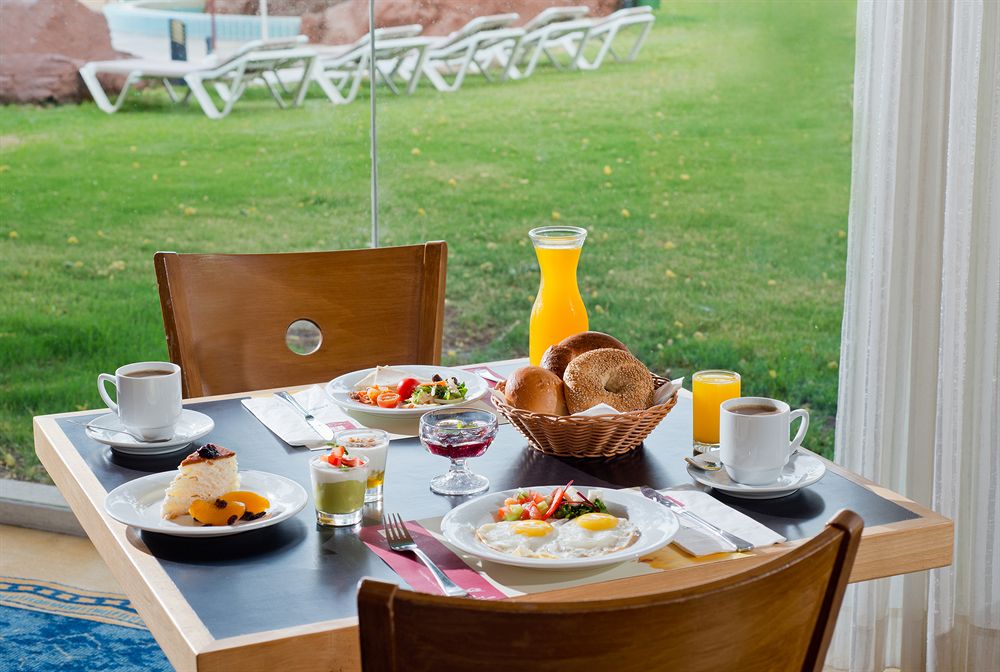 - Ресторан Галерея - главный ресторан гостиницы с тщательно продуманным интерьером. Здесь подают разнообразные завтраки и ужины - Ресторан Ла Терраса расположен на балконе с видом на бассейн.Его специализация легкие молочные блюда. - Израильский бар-гриль Патио: в будние дни с 13.00 до 16.00 здесь подают отличные мясные блюда с широким ассортиментом средиземноморских салатов, - Лобби-бар Амадеус расположен на крытом балконе, окруженном зеленью. Здесь подают разнообразные молочные блюда. В зимние месяцы ежедневно с 17.00 до 17.30 в лобби гостиницы проводится Английское чаепитие, а с 23.20 до 24.00 гостей приглашают на Полуночное наслаждение - горячий или холодный пунш, горячий сидр и пр.