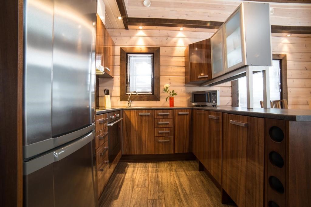 У котеджі (Levi Holidays, Сottage 8+1 pax, 4 bdrs 240 м2, житлова 150 м2): на першому поверсі: кухня, вітальня (ТВ/DVD/Karaoke), камін, 2 спальні, душова, туалет, ванна кімната, сауна (вихід на терасу). На другому поверсі: 2 спальні з виходом на балкон, телевізор, туалет, умивальник, пральна машина. Кухня обладнана сучасним побутовим обладнанням, посуд, плита, духова шафа, холодильник, посудомийна машина, мікрохвильова піч, кавоварка, чайник, тостер, пральна машина, сушильна шафа, праска та прасувальна дошка, розетка для обігріву автомобіля, дрова для каміна. Wi-Fi (безкоштовно); максимальне розміщення 8 дор. + 1 дод. місце