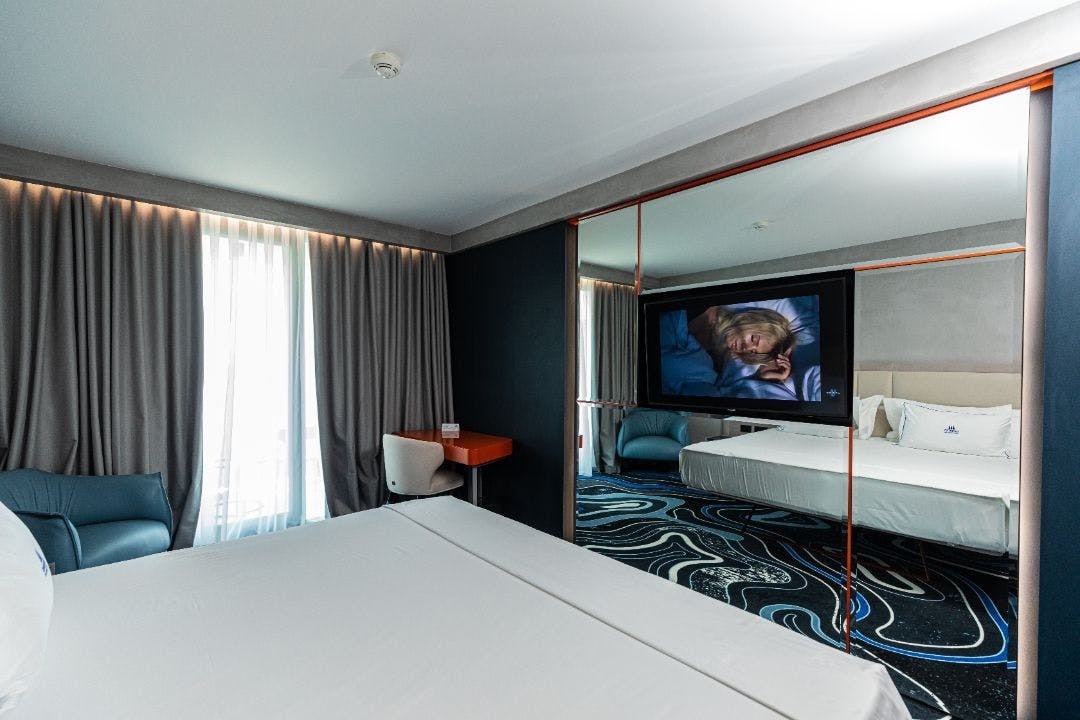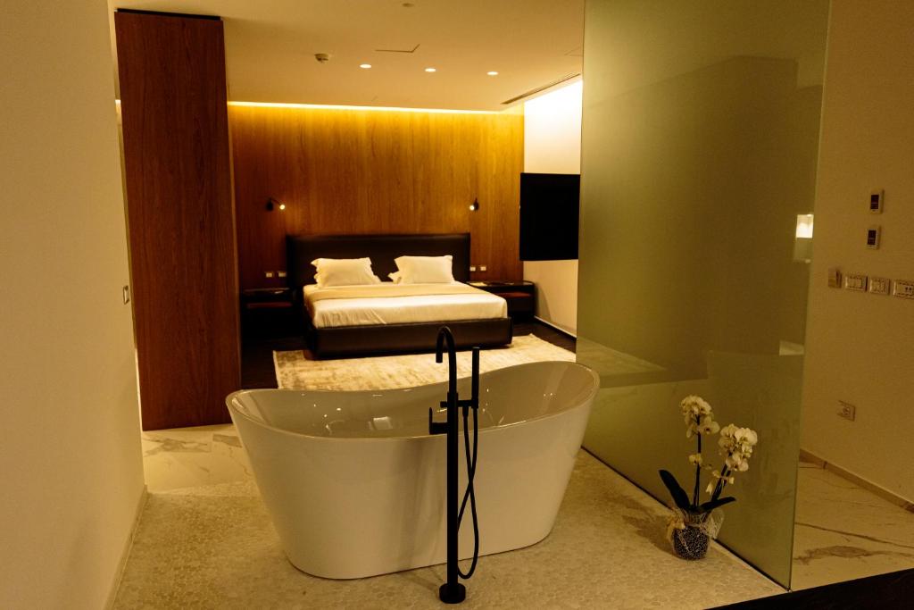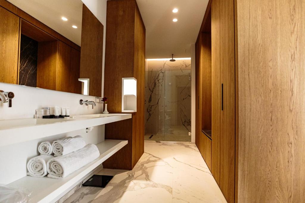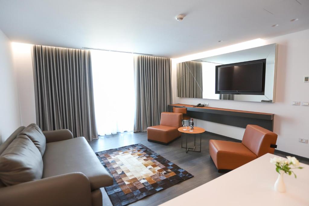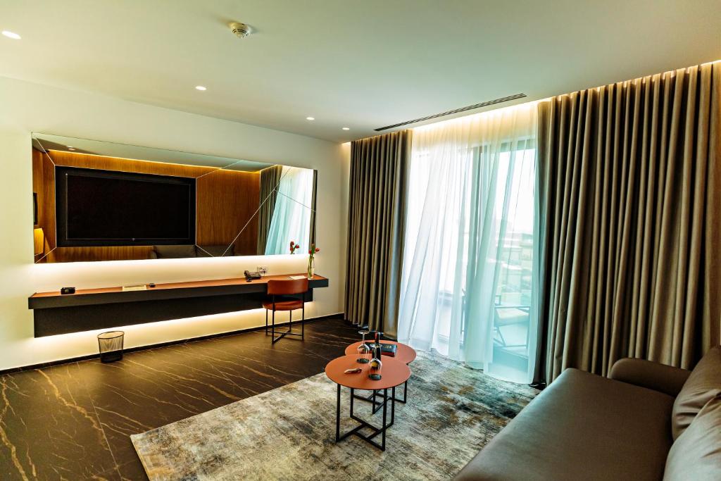 JUNIOR SUITE / JUNIOR SUITE DELUXE, близько 97 м², двокімнатний напівлюкс, розділений коридором на спальню з двоспальним ліжком King size та невелику вітальню з диваном, який може бути спальним місцем для 2-х осіб. Максимальне розміщення – 4 дорослих та 1 дитина до 5 років (спить у дитячому ліжечку або разом з батьками). Усього в готелі 10 номерів. Вони поділяються за наявності виду на море на: ● Junior Suite - без виду на море або з частковим виглядом, оскільки вид блокує будівлю, що попереду стоїть; ● Junior Suite Deluxe – з прямим видом на море. FAMILY JUNIOR SUITE / FAMILY JUNIOR SUITE DELUXE, близько 97 м², двокімнатний сімейний напівлюкс, розділений коридором на дві спальні: у першій - двоспальне ліжко King size, у другій - два ліжка (100х200). Максимальне розміщення – 4 дорослих та 1 дитина до 5 років (спить у дитячому ліжечку або разом з батьками). Усього в готелі 10 номерів. Вони поділяються за наявності виду на море на: ● Family Junior Suite - без виду на море або з частковим виглядом, оскільки вид блокує будівлю, що попереду стоїть. ● Family Junior Suite Deluxe – з прямим видом на море. FAMILY SUITE / FAMILY SUITE DELUXE, близько 107 м², трикімнатний сімейний люкс, розділений коридором на дві спальні та вітальню. У першій спальні - двоспальне ліжко King size, у другій - два полуторні ліжка (100х200), у вітальні - диван, який може бути використаний як додаткове спальне місце для 1-2 осіб. У цьому номері є дві ванні кімнати. Максимальне розміщення: 4 дорослих та 1 дитина до 5 років (спить у дитячому ліжечку або разом з батьками) + 1-2 особи на дод. місцях за доплату. Всього в готелі є 2 номери, які відрізняються видом: ● Family Suite - з частковим видом на море, оскільки вид блокує будівлю, що попереду стоїть; ● Family Suite Deluxe – з прямим видом на море. SUITE/SUITE DELUXE, близько 97 м², просторий люкс для пари, поділений на зону спальні та зону вітальні. У спальні – двоспальне ліжко King size, у вітальні – диван, який може бути додатком