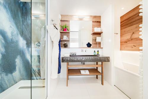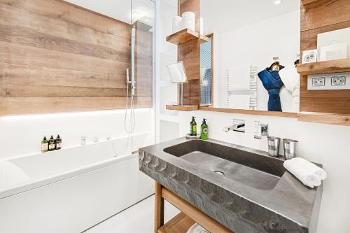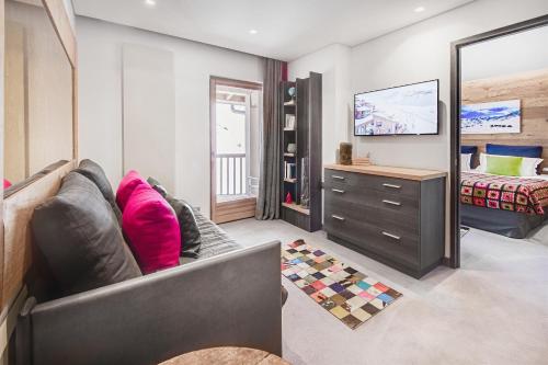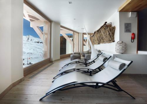 Suite de Luxe 2 Chambres - Cosy Home XL: 85 м² – Цей люкс оснащений телевізором із плоским екраном і супутниковими каналами, сейфом, міні-баром і телефоном. Кухня обладнана плитою, духовкою, посудомийною машиною та кавоваркою Nespresso. Кухня виходить у їдальню та вітальню з кутовим диваном і дров'яною піччю. Є альковка для сну з односпальним ліжком. В одній спальні є власна ванна кімната з гідромасажною ванною та душем. В іншій спальні є ванна кімната з душем. Chambre Triple: 37 м² - Цей тримісний номер має балкон, телевізор із плоским екраном і супутниковими каналами, док-станцію, сейф, міні-бар, телефон і вітальню з диваном-ліжком, розділеним розсувними дверима. У цьому номері є дві ванні кімнати, одна окрема з ванною, а інша з душем. Туалет окремий. Більшість тримісних номерів мають балкон (за наявності). Chambre Deluxe: 33 м² - Цей двомісний номер має власну ванну кімнату з ванною, душем, феном, халатами та безкоштовними туалетно-косметичними засобами. Звукоізольований та просторий двомісний номер з видом на гори оснащений міні-баром, кавоваркою та телевізором із плоским екраном і кабельними каналами. Suite de Luxe 2 Chambres - Cosy Home: 65 м² – Цей люкс з південною орієнтацією обладнано телевізором з плоским екраном і супутниковими каналами, док-станцією, сейфом, міні-баром і телефоном. Кожна спальня має власну ванну кімнату. Кухня обладнана плитою, духовкою, посудомийною машиною та кавоваркою Nespresso. Кухня виходить на обідню зону та вітальню з великим диваном. Деякі люкси мають мезонін і дров'яну піч. Harmony Family Suite: 60 м² – Просторий чотиримісний номер має звуконепроникні стіни, міні-бар, балкон з видом на гори та власну ванну кімнату з ванною. У номері є чотири ліжка. Suite de Luxe 3 Chambres - Cosy Home XXL: 120 м² – Цей люкс з південною орієнтацією має балкон з південною орієнтацією, телевізор з плоским екраном і супутниковими каналами, док-станцію, сейф, міні-бар і телефон. Кожна спальня має власну ванну кімнату. Кухня обладнана плитою, духовкою, посудомийною машиною та кавоваркою Nespresso. Кухня виходить у їдальню та вітальню з двома великими диванами та каміном. Деякі люкси мають окремий хамам. Capsule Igloo: 19 м² – Цей геодезичний купол, що виходить на південний схід, розташований на даху готелю. У куполі є двоспальне ліжко, дров'яна піч і власна ванна кімната з душем і туалетом. Suite de Luxe 1 Chambre - Cosy Home: 60 м² – Цей люкс має балкон з південної сторони, телевізор з плоским екраном і супутниковими каналами, док-станцію, сейф, міні-бар, телефон і кухню, обладнану плитою, духовкою, посудомийною машиною та кавоваркою Nespresso. Кухня виходить у простору вітальню з диваном-ліжком, дров'яною піччю та обіднім столом. У власній ванній кімнаті є гідромасажна ванна та окремий туалет. Suite Prestige (4 Adultes): 70 м² – Цей просторий люкс з власним хамамом має телевізор з плоским екраном і супутниковими каналами, док-станцію, сейф, міні-бар, телефон і велику вітальню з диваном. В одному з цих престижних люксів є дров'яна піч, а в іншому – балкон з видом на гори (за наявності). Chambre Triple de Luxe (3 Adultes): 45 м² - Цей тримісний номер має балкон з південної сторони, телевізор з плоским екраном і супутниковими каналами, док-станцію, сейф, міні-бар і телефон. Він також має окрему спальню та вітальню, розділені розсувними дверима та обладнані великим дизайнерським диваном. У ванній кімнаті є душ і ванна. Туалет окремий. Pod-Igloo avec Jacuzzi: 19 м² - Цей двомісний номер пропонує гідром
