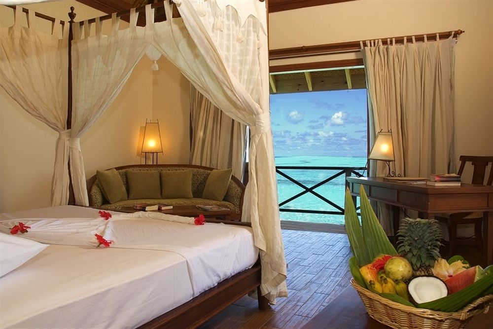 Grand reef suite (220 кв. м): тераса з відкритим персональним басейном, вітальня з обідньою зоною, міні-кухня, 2 спальні (кожна – з ліжком king-size), ванна кімната. Додатково: кавоварка Nespresso. Розташований на палях над водою біля північного узбережжя острова.