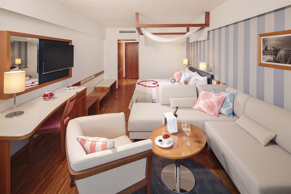 Romantic room (30 кв.м.): - балкон, вид на море, - романтический декор, - двуспальная кровать с балдахином, - романтическое постельное белье, - диван, - мини-бар с шампанским, - десертными винами и шоколадом (за дополнительную плату), - ЖК-телевизор, - DVD плеер, - романтические фильмы на DVD, - романтические книги, - дополнительные косметические принадлежности и косметика, - халаты и тапочки. Максимальное размещение: 2 человека.