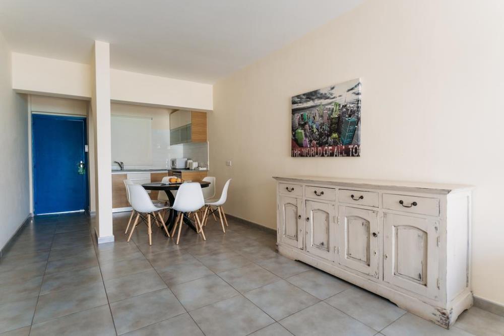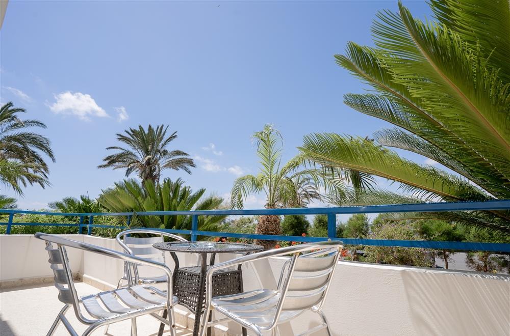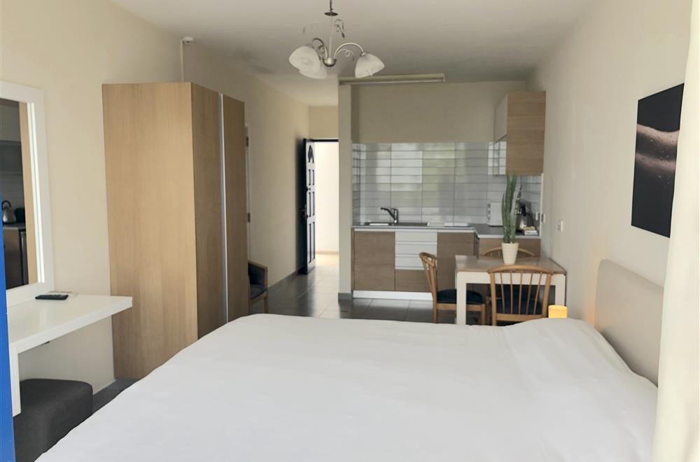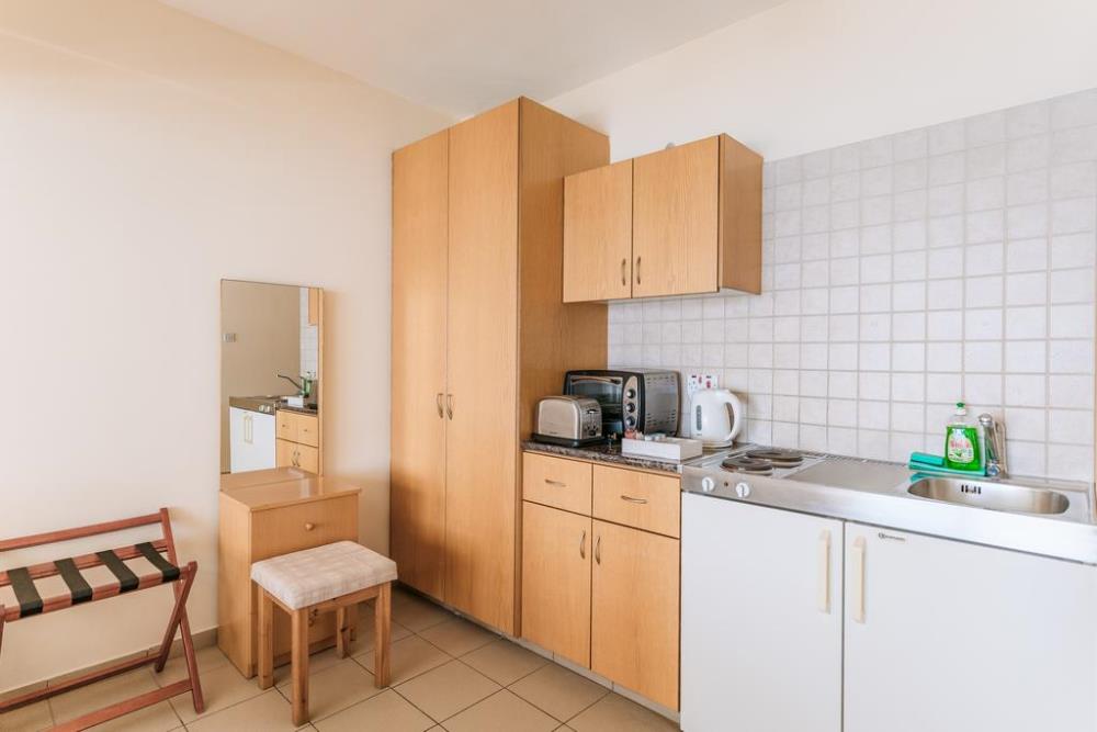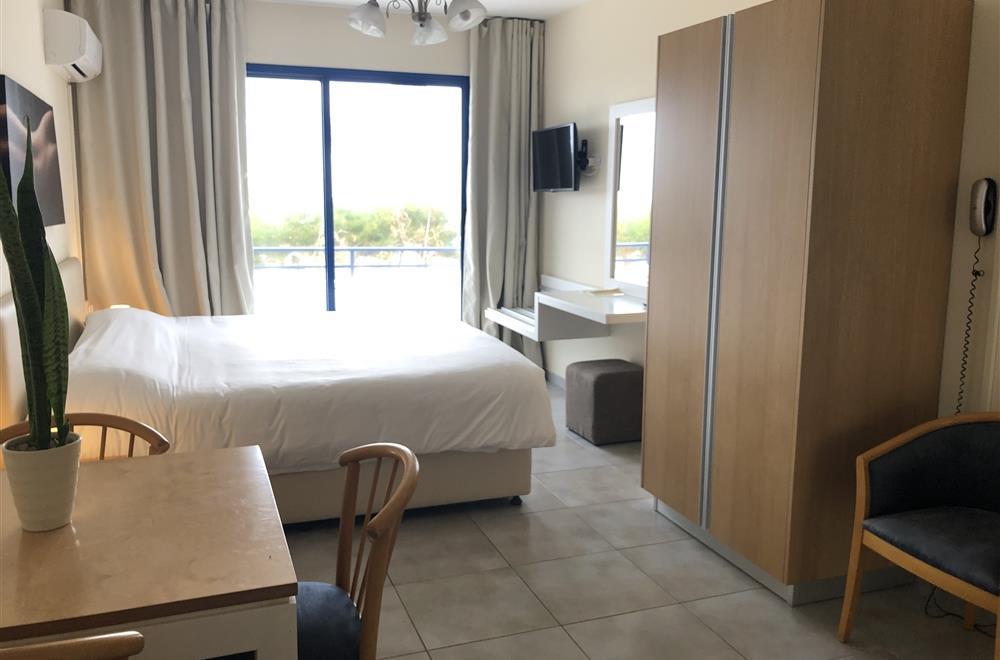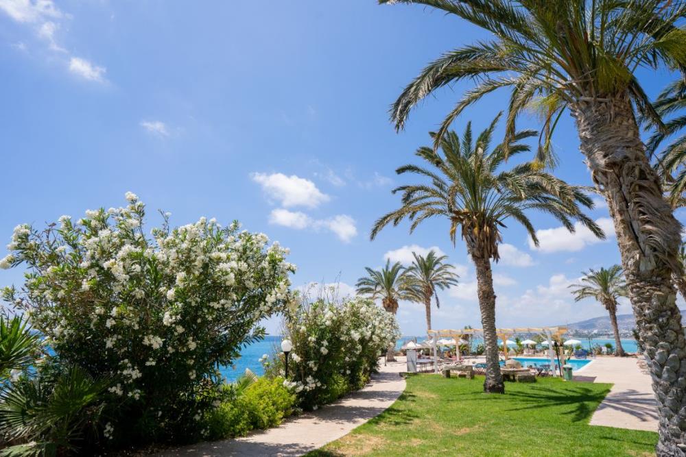 Deluxe One-Bedroom Apartment Sea View розташовані на першому поверсі у західній частині готелю та можуть вмістити до 4 дорослих. Ці апартаменти мають повний вид на Середземне море, вітальню/їдальню, спальню з одним двоспальним або двома односпальними ліжками, ванну кімнату з душовою кабіною, міні-кухню та диван-ліжко, яке розкладається на двоспальне ліжко. Deluxe Studio with Sea View розташовані на першому поверсі у західній частині готелю та можуть вмістити до трьох дорослих. З них відкривається панорамний вид на Середземне море. Вони являють собою номери відкритого планування з повністю обладнаною міні-кухнею, одним двоспальним або двома односпальними ліжками, диваном-ліжком, обідньою зоною та окремою ванною кімнатою з душовою кабіною. Standard Studio with Garden View Ці стандартні студії розташовані на першому поверсі зі східної сторони готелю та можуть вмістити до трьох дорослих. Це номери відкритого планування з видом на сад, повністю обладнаною міні-кухнею, двоспальним або двома односпальними ліжками, диваном-ліжком, обідньою зоною та окремою ванною кімнатою з ванною. Standard Studio with Sea View розташовані на другому поверсі із західної сторони готелю та можуть вмістити до трьох дорослих. З них відкривається панорамний вид на Середземне море. Це номери відкритого планування з повністю обладнаною міні-кухнею, двоспальним або двома односпальними ліжками, диваном-ліжком, обідньою зоною та окремою ванною кімнатою з ванною. Standard One-Bedroom Apartments with Garden View розташовані на першому поверсі у східній частині готелю та можуть вмістити до 4 дорослих. Ці номери мають окрему вітальню/їдальню, окрему спальню з двоспальним або двома односпальними ліжками, окрему ванну кімнату з ванною, міні-кухню та два дивани-ліжка, а також виходять вікнами на сад. Standard One-Bedroom Apartment with Sea View розташовані на першому та другому поверсі у західній частині готелю та можуть вмістити до 4 дорослих. Вони мають повний вид на Середземне море та мають окрему вітальню/їдальню, окрему спальню з двоспальним або двома односпальними ліжками, окрему ванну кімнату з ванною, міні-кухню та два дивани-ліжка. Superior Studio with Sea View розташовані на першому поверсі у західній частині готелю та можуть вмістити до трьох дорослих. З них відкривається панорамний вид на Середземне море. Вони являють собою номери відкритого планування з повністю обладнаною міні-кухнею, двоспальним або двома односпальними ліжками, диваном-ліжком, обідньою зоною та окремою ванною кімнатою з ванною. Superior One-Bedroom Apartment with Sea View розташовані на першому та другому поверхах у західній або східній частині готелю та можуть вмістити до чотирьох дорослих. З них відкривається панорамний вид на Середземне море, окрема вітальня/їдальня, окрема спальня з двоспальним або двома односпальними ліжками, окрема ванна кімната з ванною, міні-кухня та два дивани-ліжка. Superior Two-Bedroom with Sea View розташовані на першому та другому поверхах із західної або східної сторони готелю та можуть вмістити до шести дорослих. З них відкривається панорамний вид на Середземне море, окрема вітальня/їдальня, дві окремі спальні з двоспальним та двома односпальними ліжками, окрема ванна кімната з ванною, міні-кухня та два дивани-ліжка. Junior Suite with Sea View розташовані на третьому поверсі в передній частині готелю та можуть вмістити до трьох дорослих. Ці люкси призначені лише для дорослих. З них відкривається пан