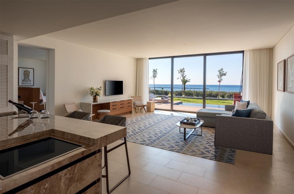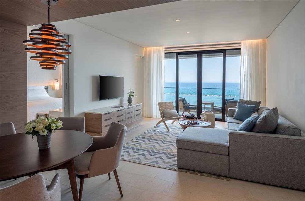 Deluxe Suite One Bedroom Sea View – 90 кв.м. (макс. 2+2): спальня з ліжком розміру "queen-size" або "king-size", вітальня з диваном, обідня зона, мармурова ванна кімната