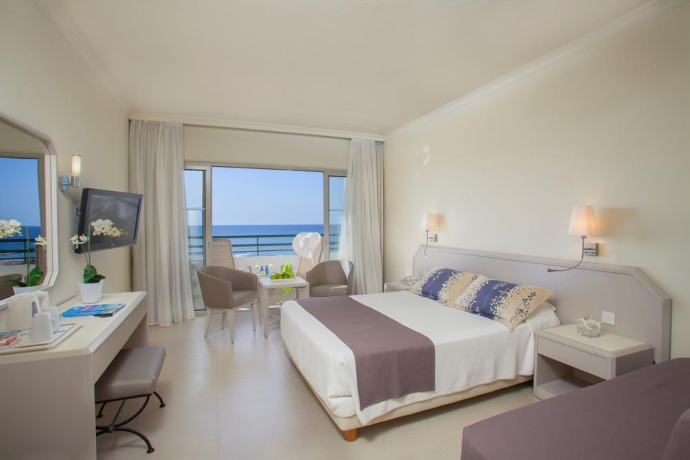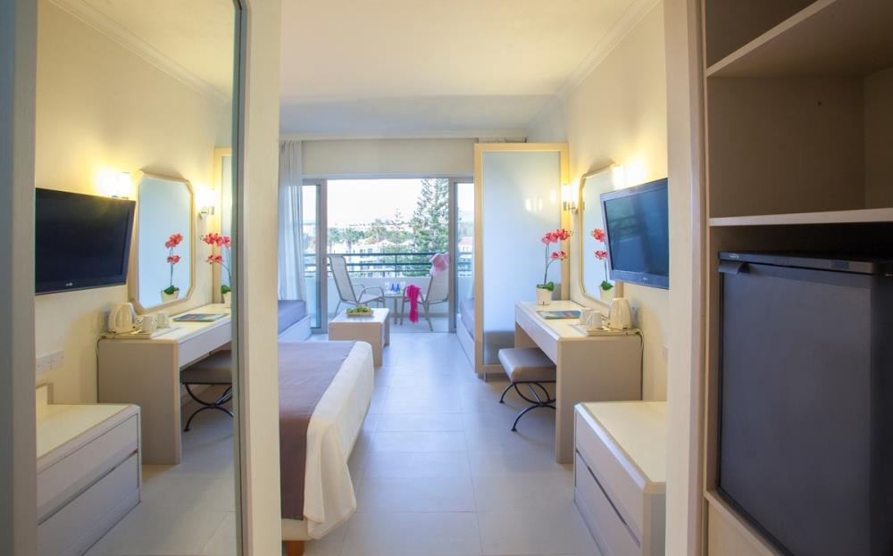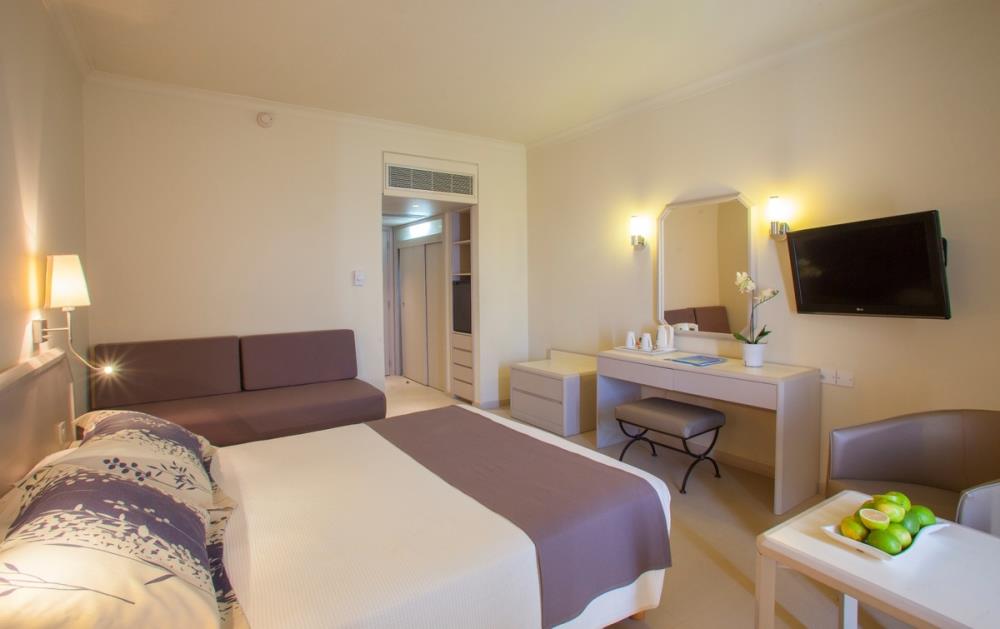 Family Room - Inland View or Sea View - Розміщення: до 4 осіб Ліжко(а): 1 двоспальне ліжко розміру "queen-size" та 2 дивани-ліжка Розмір: 26 м² Сімейні номери з видом на суходіл, місто Пафос та околиці або з видом на чудове Середземне море та басейни складаються зі спальні з одним двоспальним ліжком та 2 диванами-ліжками, розділеними декоративною напівроздільною перегородкою, що не закривається. Мармурові підлоги, приватний балкон та світлий, елегантний інтер'єр підходять для кожної родини.