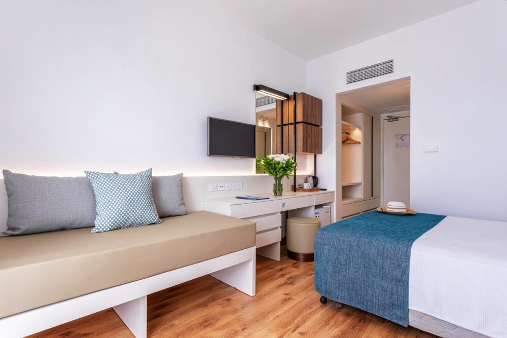 Double / Twin Room Розміщення: до 3 осіб Ліжко(а): 1 двоспальне ліжко або 2 односпальні ліжка з диваном-ліжком Розмір: 19 м2 Світлі та просторі номери з балконом або терасою. З вікон відкривається вид на море або суходіл, усі двомісні номери можна розділити на два односпальні ліжка, є місце для дитячого ліжечка. Вони оснащені кондиціонером, дуже зручною постільною білизною, невеликим холодильником та власною ванною кімнатою з ванною.
