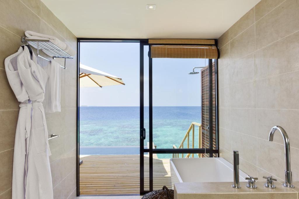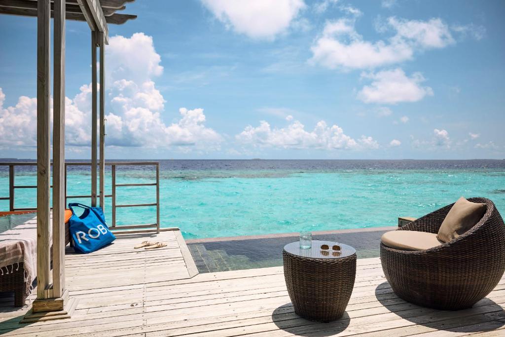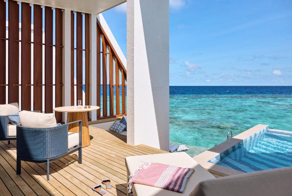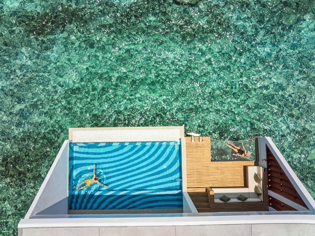 Funamadua One Bedroom Water Villa Pool (водна вілла, вид на море, вітальня та спальня, ліжко king-size, ванна кімната з 2 душами (1 з них на відкритому повітрі), частково крита тераса із відпочинковою зоною, басейн, гамак, прямий спуск у воду, 3 чол макс.,87 м)