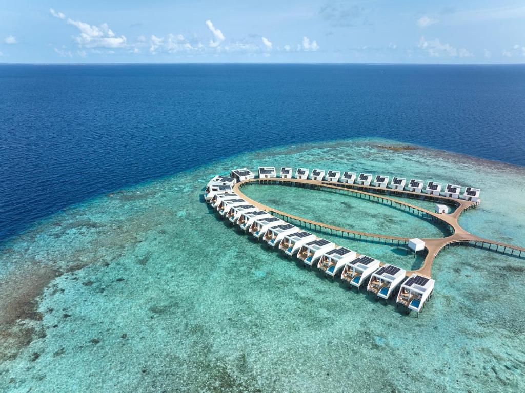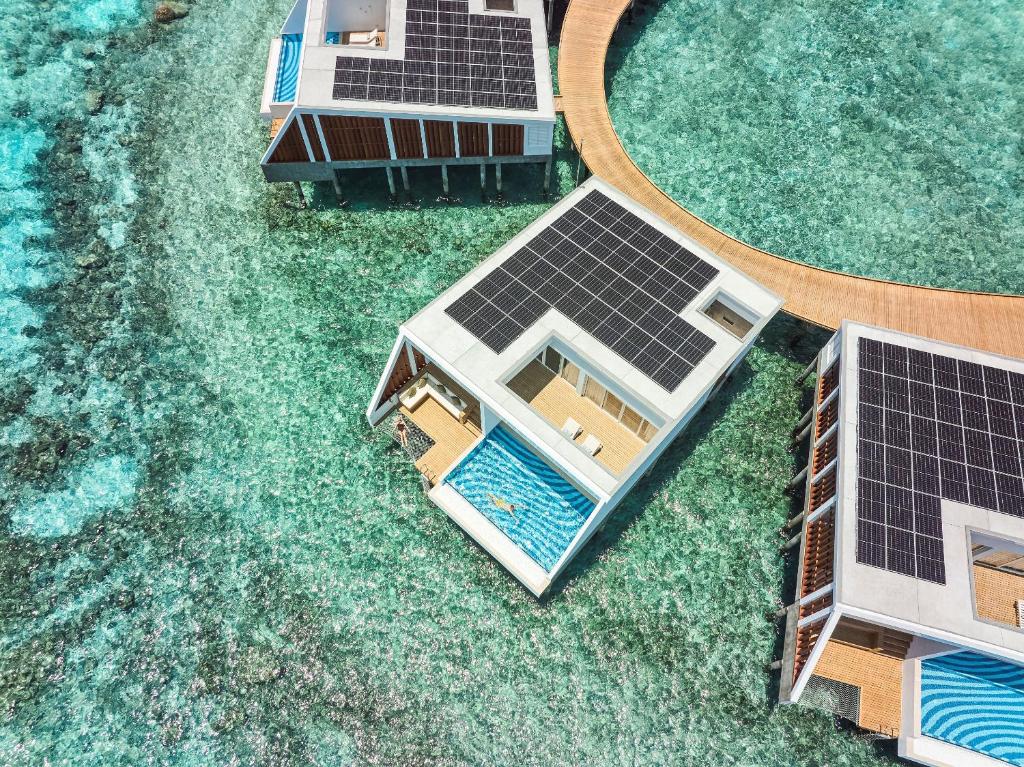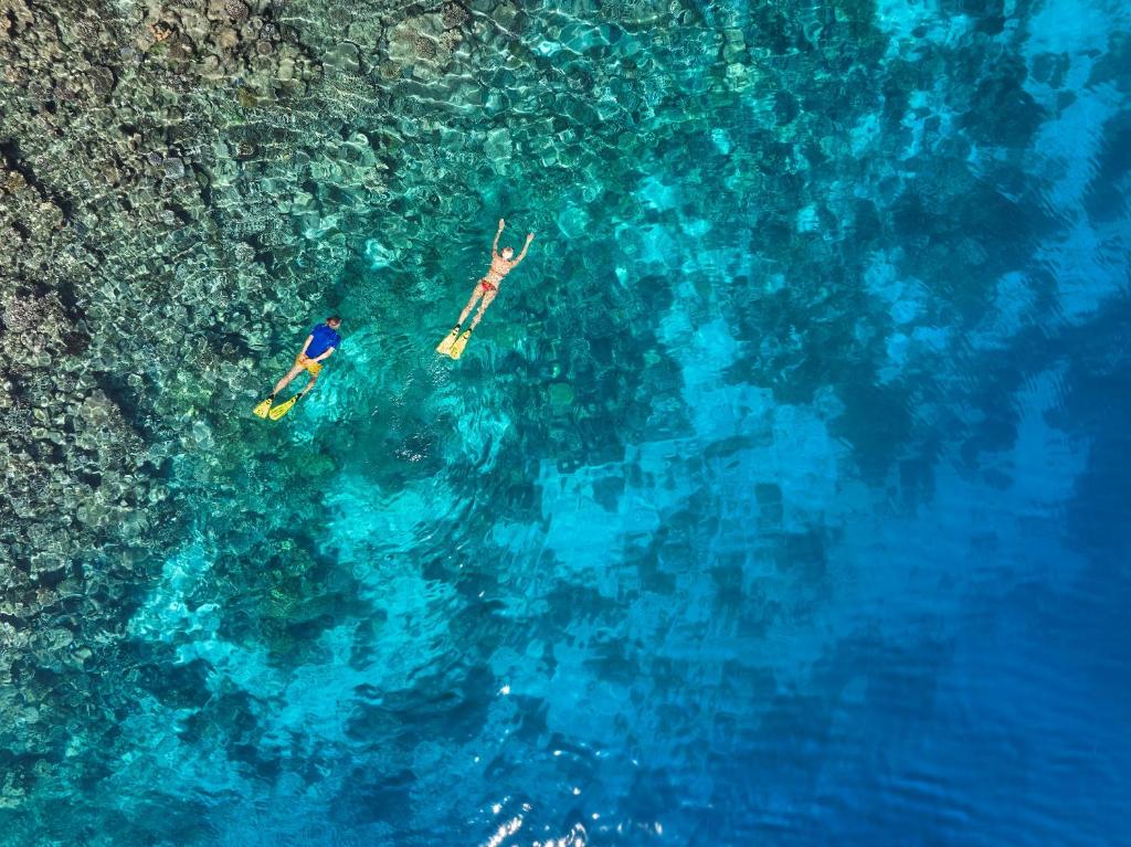 Exclusive Reef Water Villa Pool (водяні вілли, що окремо стоять, вид на море, спальня і зона вітальні, ліжко King, ванна кімната з 2 душами (1 з них на відкритому повітрі), тераса, басейн, тахта для відпочинку, гамак, прямий спуском у воду, 3 чол макс.,58 м