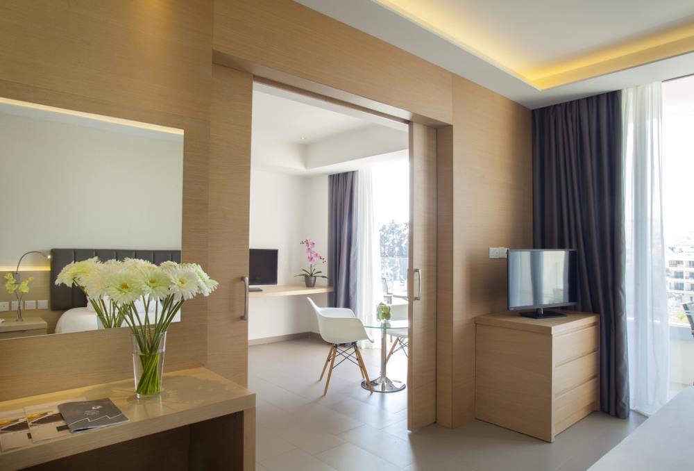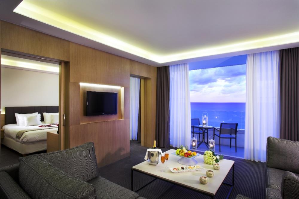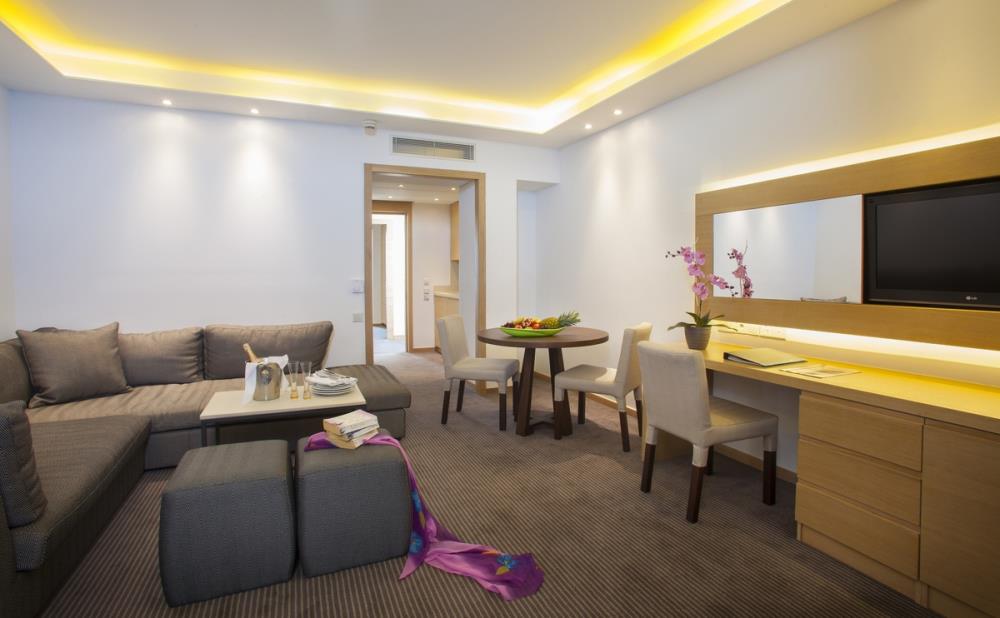 Superior Room Inland View 26 кв. м. (макс. 3) спальня відкритого планування, двоспальне або односпальне ліжко, душ, балкон або тераса з внутрішнім виглядом Superior Room Sea View 26 кв. м. (макс. 3) спальня відкритого планування, двоспальне або односпальне ліжко, душ, балкон або тераса з видом на море Junior Suite Inland View 39 кв. м. (макс. 4) односпальне ліжко, спальня, лаунж з диваном-ліжком, душ, балкон або тераса Deluxe Spa Room Sea View Private Outdoor Jacuzzi 26 кв. м. (макс. 3) спальня відкритого планування, двоспальне ліжко або односпальне ліжко, душ, тераса 6 кв. м. з джакузі Executive Suite Sea View 56 кв. м. (макс. 4) двоспальне ліжко в головній спальні, простора вітальня, дві ванні кімнати, балкон або тераса з видом на море Deluxe Suite Sea View 65 кв. м. (макс. 4) двоспальне ліжко в спальні, вітальня з двоспальним диван-ліжком, кухонний куточок з обідньою зоною, дві ванні, балкон або тераса з видом на море Honeymoon Suite Sea View 56 кв. м. (макс. 2) ліжко королівського розміру, спальня з розсувними дверима, простора вітальня, джакузі у ванній, балкон або тераса У номерах: Кондиціонер Wi-Fi (безкоштовно) Телефон із прямим набором номера Супутникове ТБ Міні-бар Приладдя для приготування чаю та кави Фен Банний халат та тапочки Сейф (безкоштовно) 24 годинне обслуговування в номерах Фрукти та пляшка мінеральної води під час заїзду Дитяче ліжечко (безкоштовно)