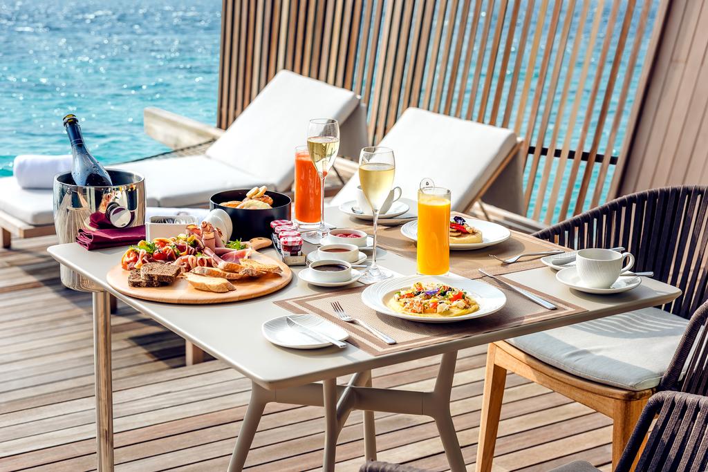 Crust – піцерія. A la carte. Розташована на пляжі. Відкрито з 11:30 до 16:00. Cargo – ресторан близькосхідної кухні. Розташований у садах. Відкритий для вечерь щодня, крім середи та суботи, з 18:30 до 23:00. Alba – ресторан-бар. Італійська кухня. A la carte. Концепція шоу-кухні. Є відкрита тераса. Вид на океан та басейн. Відкрито для сніданків з 07:00 до 10:30, обідів з 11:30 до 17:00, вечері з 19:00 до 22:30. Orientale – ресторан азіатської кухні. A la carte. Концепція шоу-кухні. Є відкрита тераса. Розташований на пляжі. Вид на океан. Відкрито для вечерь з 18:30 до 22:30. Decanter – ресторан у підземному винному льоху. Призначений для приватних вечерь. Проводяться винні дегустації. Відкритий для вечерь по середах та суботах з 19:00 до 23:00 (необхідна попередня резервація). The Whale Bar – бар. Вино, коктейлі, легкі закуски, блюда з морепродуктів. Є відкрита тераса. Розташований на палях над водою. Вид на океан. Відкрито з 17:00 до 00:00.